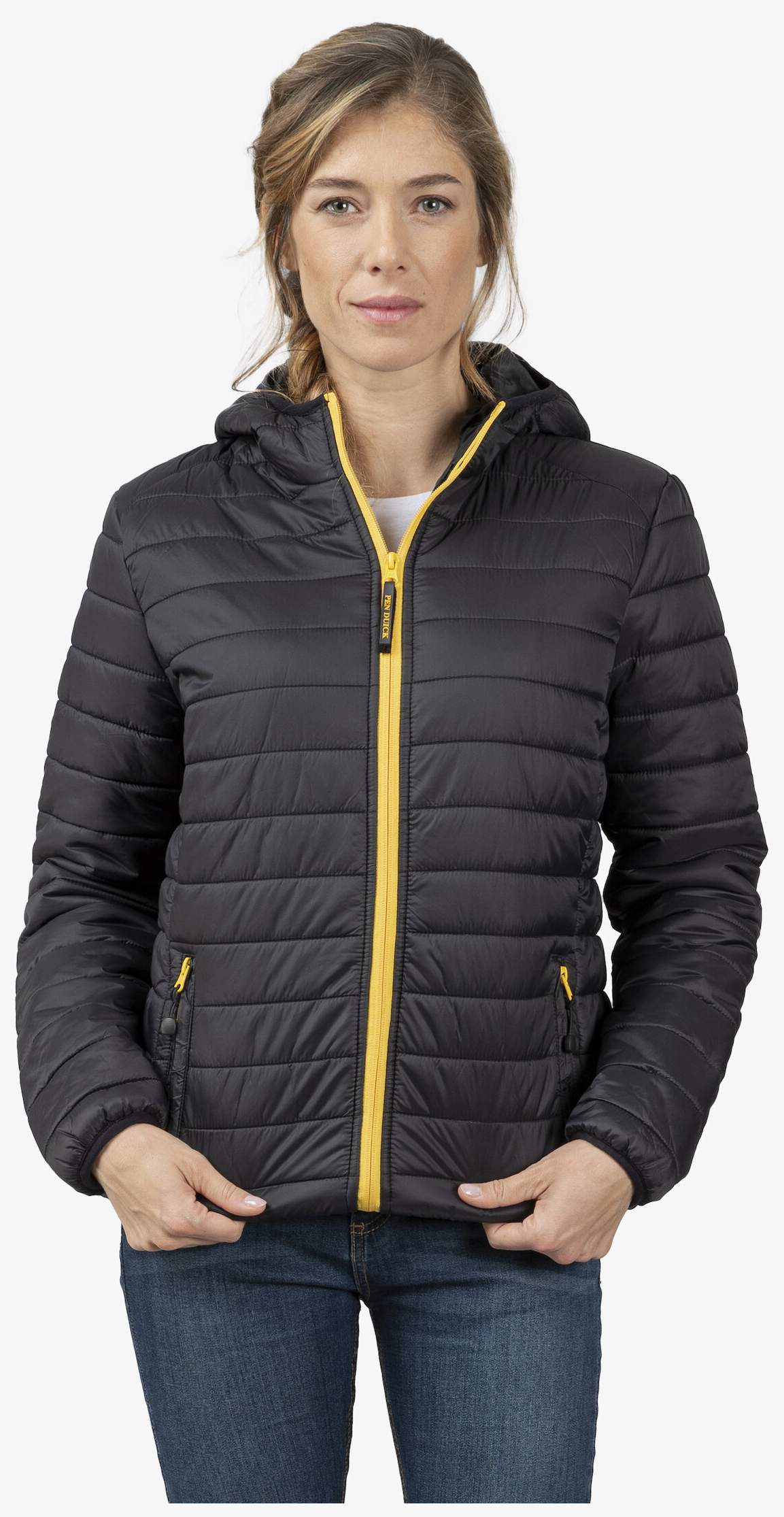 De Pacific Women lichte damesdonzen jas met capuchon geschikt voor dagelijks gebruik en verplaatsingen bij koel weer, met winddicht effect, buiten- en binnenzakken en elastische manchetten. Buitenkant: 100% nylon 15D. Binnenkant: 100% polyester gewatteerde matte tafzijde.\