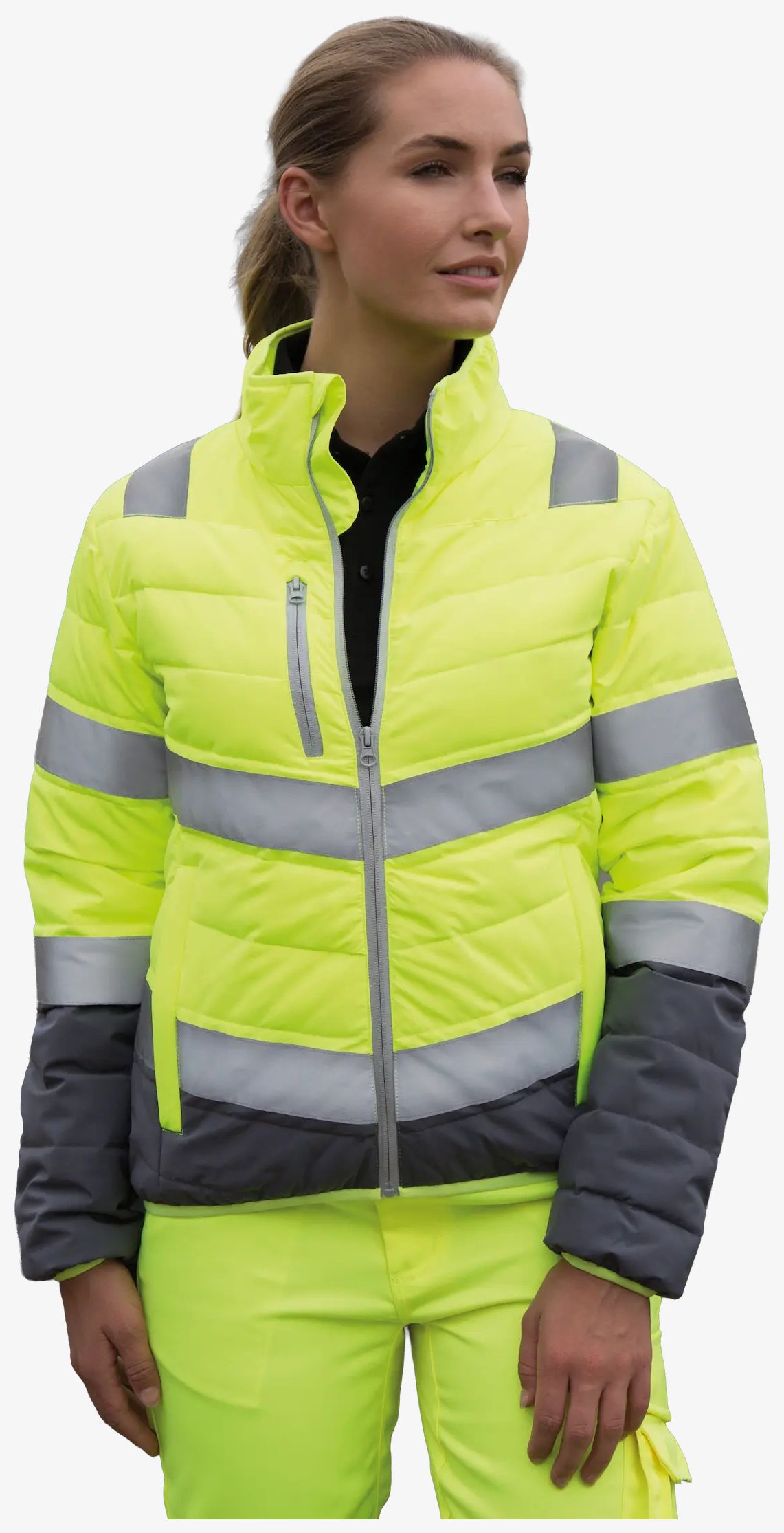 De dames veiligheidsjas is geschikt voor toepassingen die een verhoogde zichtbaarheid vereisen. De getailleerde pasvorm, de langere achterkant en de ritszakken maken dagelijks dragen praktisch. De YKK-ritssluiting met kinbescherming en de afgeboorde randen aan manchetten en taille maken het geheel af.