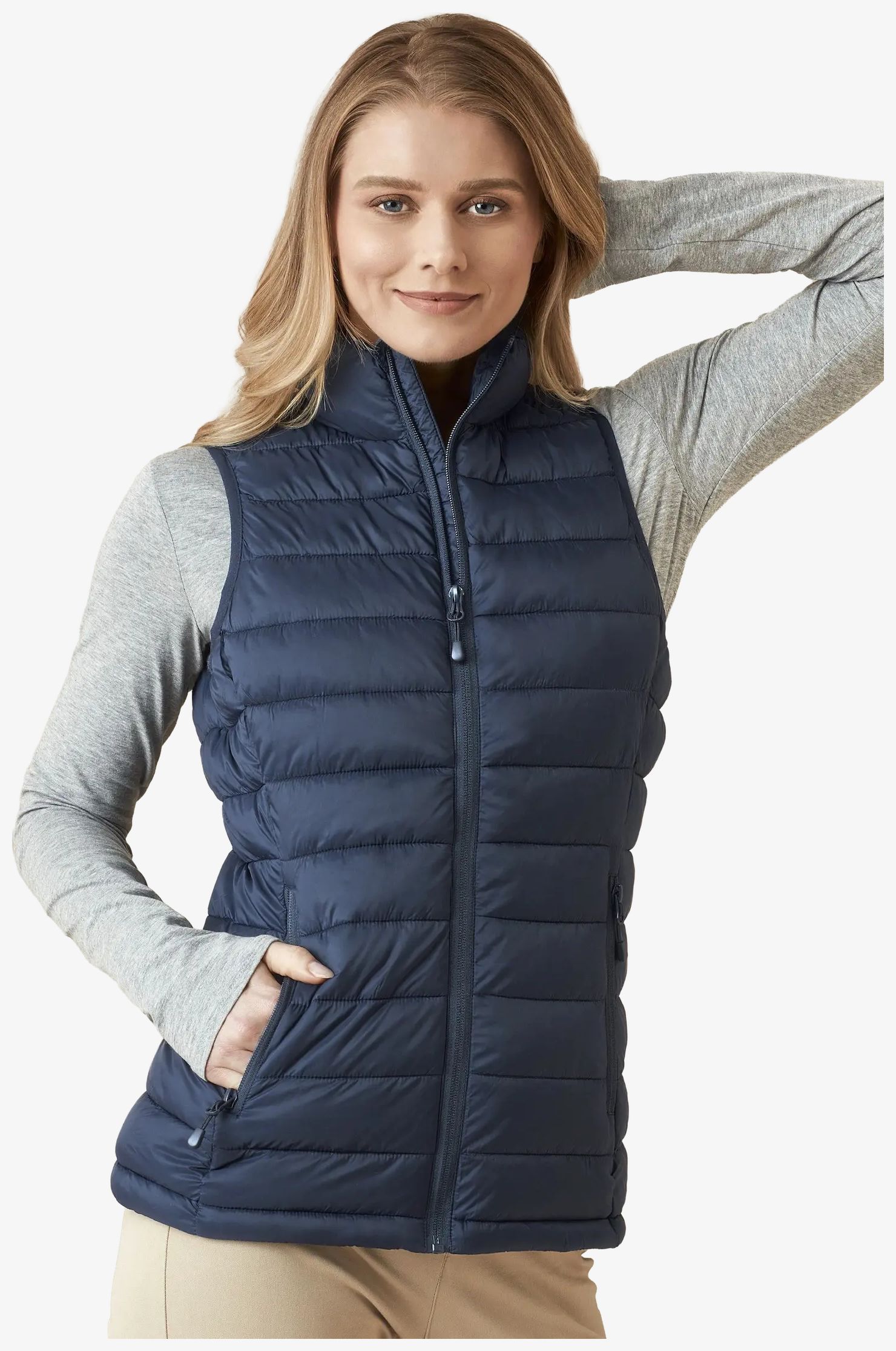 Het lichte doorgestikte damesvest zorgt voor thermische isolatie terwijl het weinig ruimte inneemt dankzij de mogelijkheid om in de binnenzak opgeborgen te worden. Het heeft een opstaande kraag en een verstelbare taille. Het sluitingssysteem gebruikt SBS-ritsen. Twee zijzakken met ritssluiting en een binnenzak zijn aanwezig.