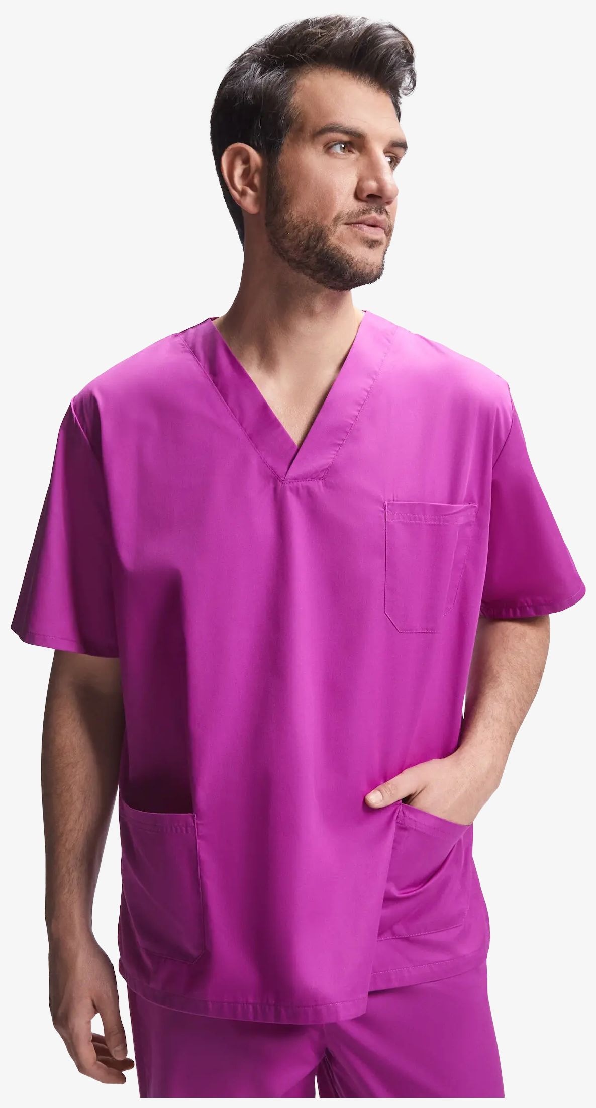 De unisex tuniek blouse met korte mouwen heeft een gekruiste V-hals. De blouse bevat een borstzak en twee zijzakken. Zij-openingen maken het dragen eenvoudiger. Het label is afneembaar.