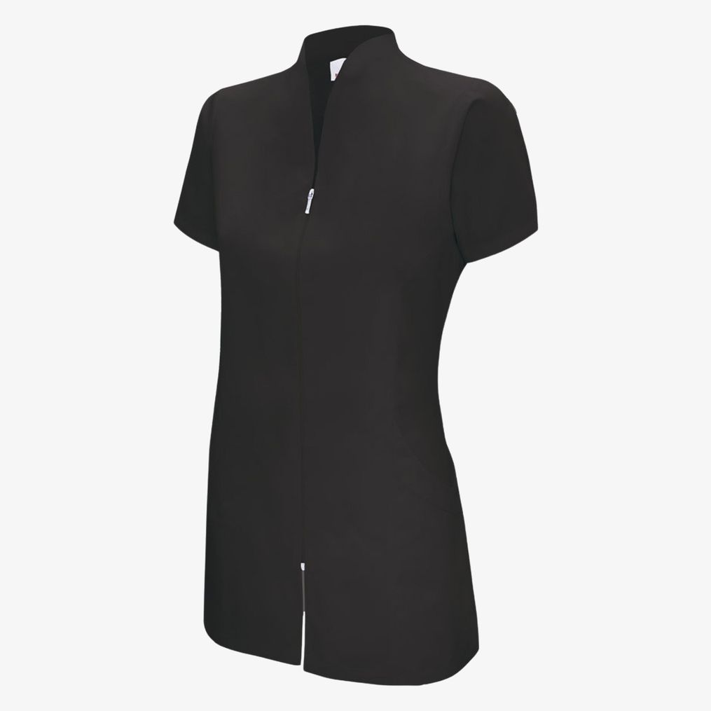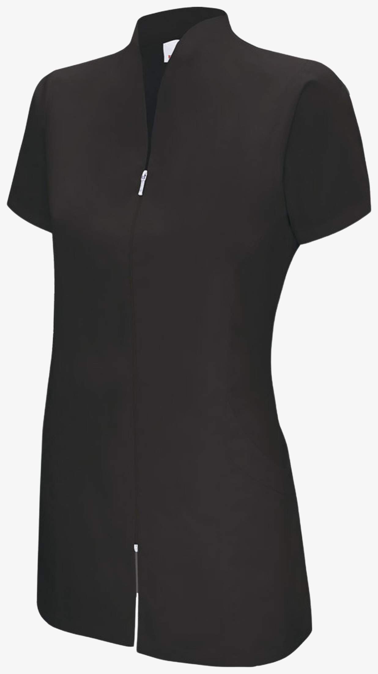 Het dames tuniek met ritssluiting wordt gekenmerkt door een staande kraag, plooien aan de achterkant, een deels getailleerde snit en korte mouwen. De samenstelling is 65% polyester en 35% katoen.