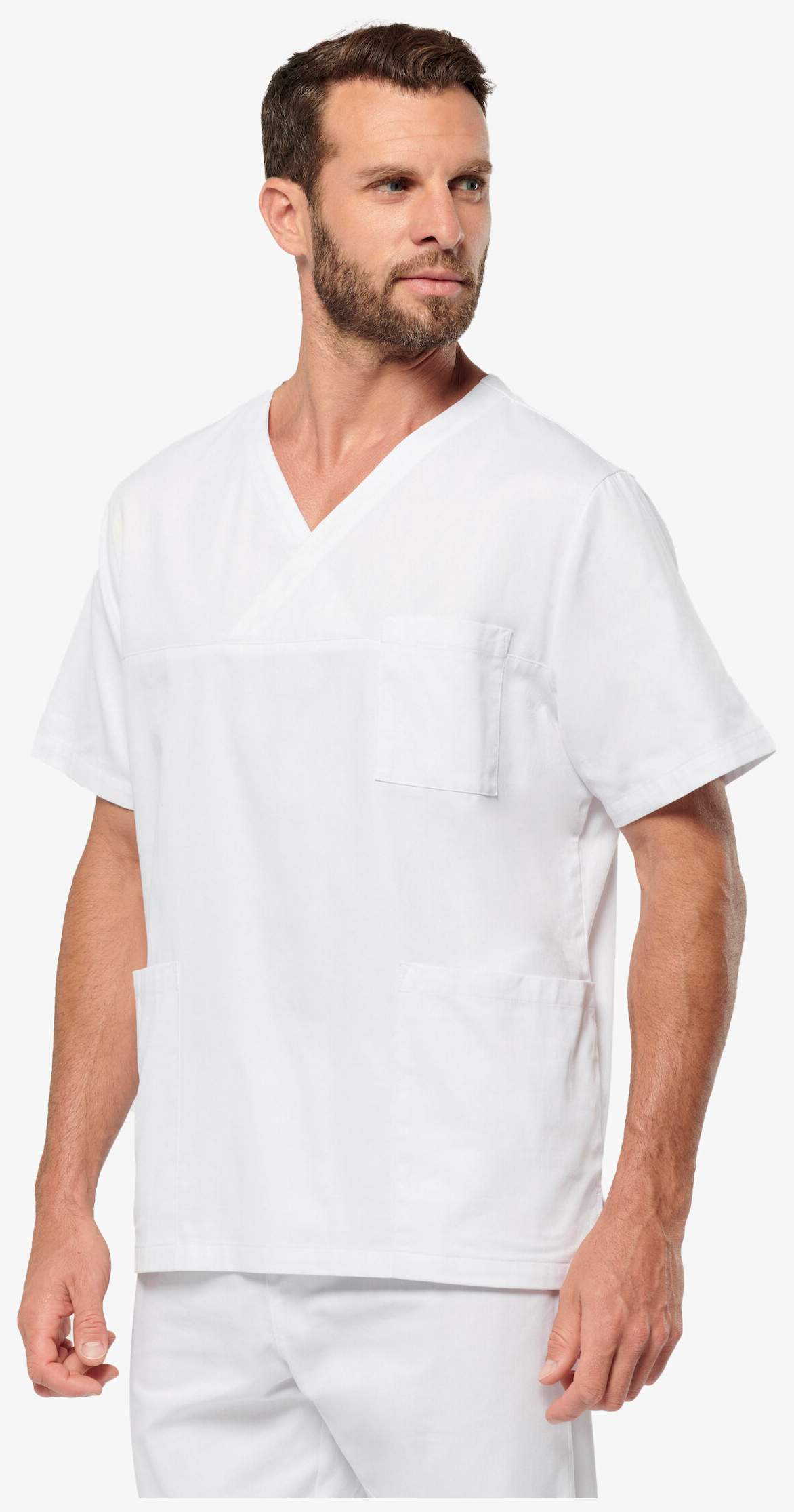 De unisex katoenen tuniek met korte mouwen heeft een comfortabele pasvorm met een oversneden V-hals. Hij bevat een opgestikte borstzak aan de hartzijde, twee grote opgestikte voorzakken en twee zijdelingse schuimopeningen.