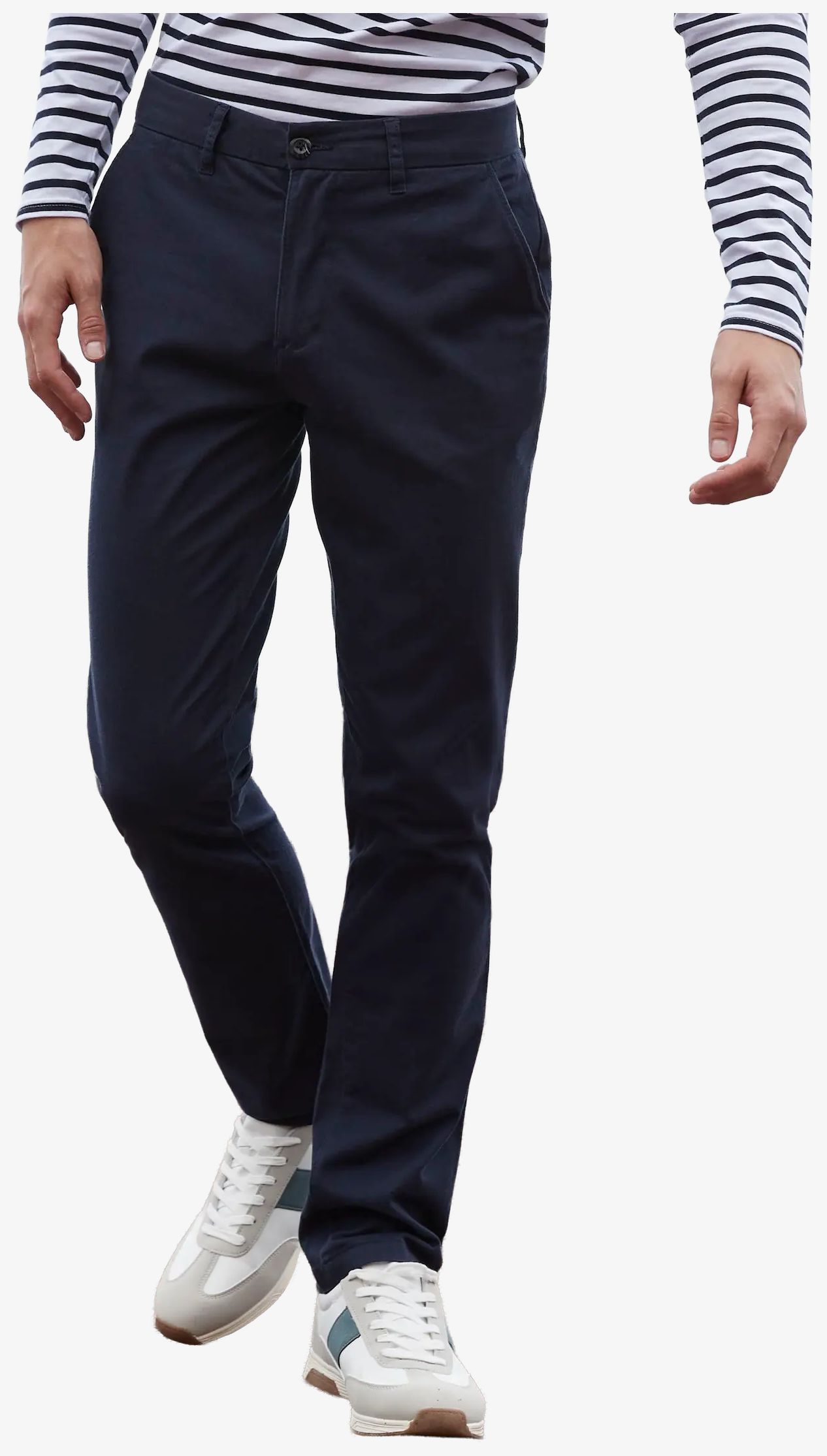 De Men's lightweight chino is een stretch herenbroek zonder plooien aan de voorkant, voorzien van twee achterzakken met bies en riemlussen. De sluiting is een rits met knoop aan de taille, de zoom is eenvoudig. De samenstelling is 97 % katoen en 3 % elastaan.