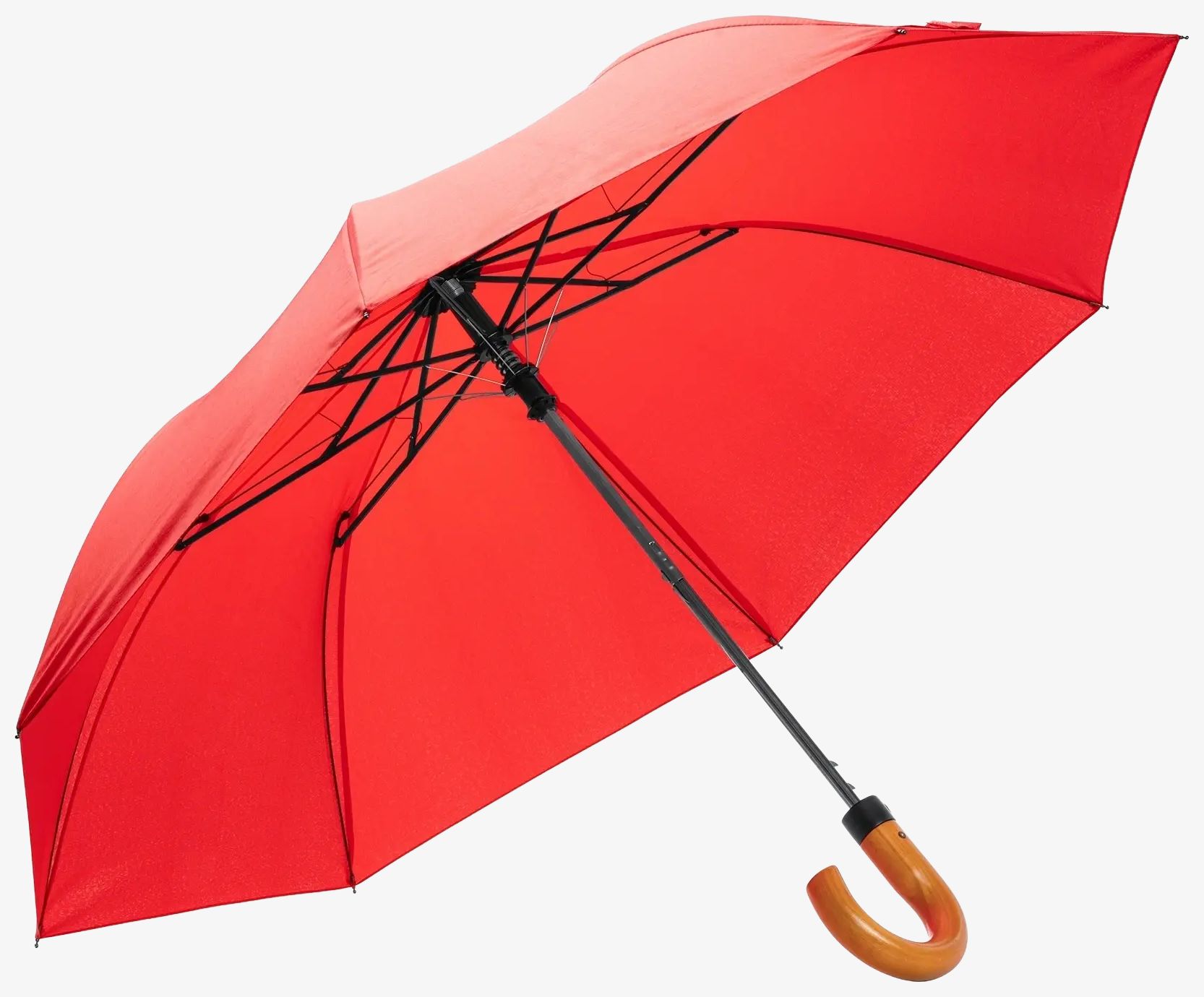 De paraplu van gerecycled polyester is gemaakt met waterafstotend pongeestof 190 T en een handvat van natuurlijk hout dat een comfortabele grip biedt. Hij heeft een automatische openingsknop en sluit met klittenband. Een bijpassende hoes wordt meegeleverd voor opslag.