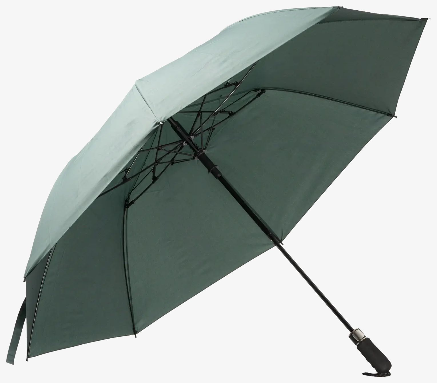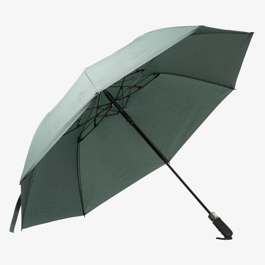 De automatisch openende inklapbare RPET-paraplu is gemaakt met pongee 210 T stof en glasvezelstangen. Hij heeft een beschermingssysteem tegen ijzige wind en een handvat van EVA. De sluiting is met klittenband. Wordt geleverd met bijpassende hoes.