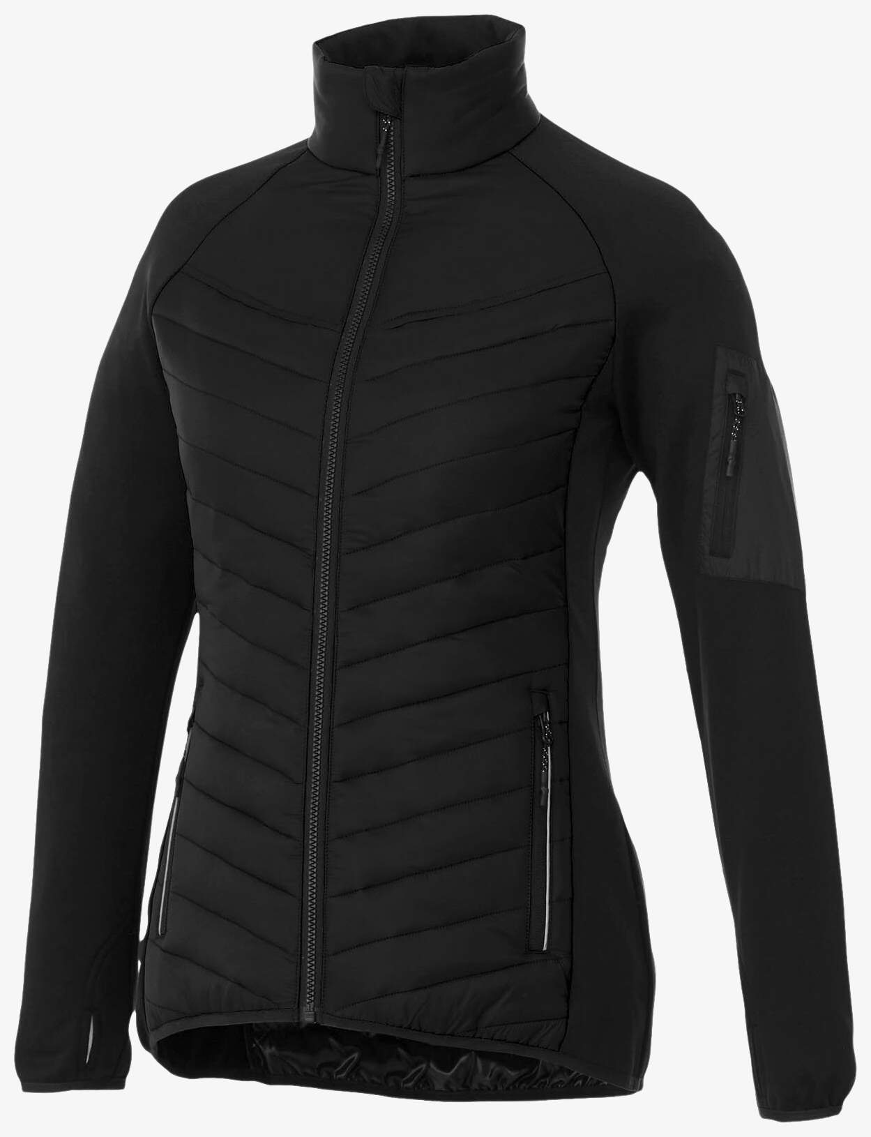 Het hybride damesjack heeft een binnenstormflap met kinbescherming, een media uitgang met koordgeleider, en een achter langere zoom. De taillepleats zijn elastisch voor pasvorm. De blootliggende metalen rits in het midden wordt vergezeld door een contrasterend lint en een gemakkelijk vast te pakken trekker.