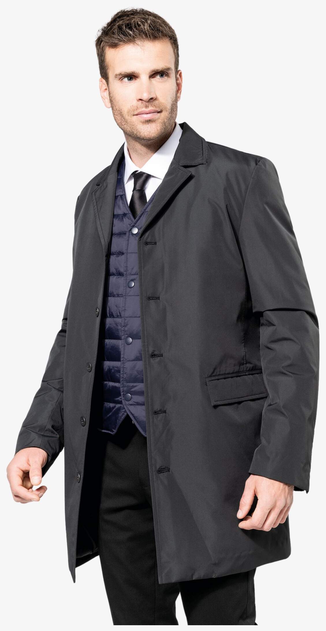 De trench structuré homme pk602 is vervaardigd uit polyester met een 3-laagse gelamineerde constructie. Hij heeft een winddichte pasvorm met een reverskraag en een contrast gevoerde binnenkraag. De voorkant sluit met metalen knopen, dezelfde bevinden zich aan de mouwuiteinden. Twee klepzakken en een paspelzak zijn aan de voorkant geplaatst, met een binnenzak met rits aan de linker binnenzijde. Het onderste deel van de rug is gespleten met een drukknop. Een lus bij de halslijn dient om het kledingstuk op te hangen. Ritssluitingen zijn geplaatst aan de binnenzijde onderaan de rug aan de linkerzijde.