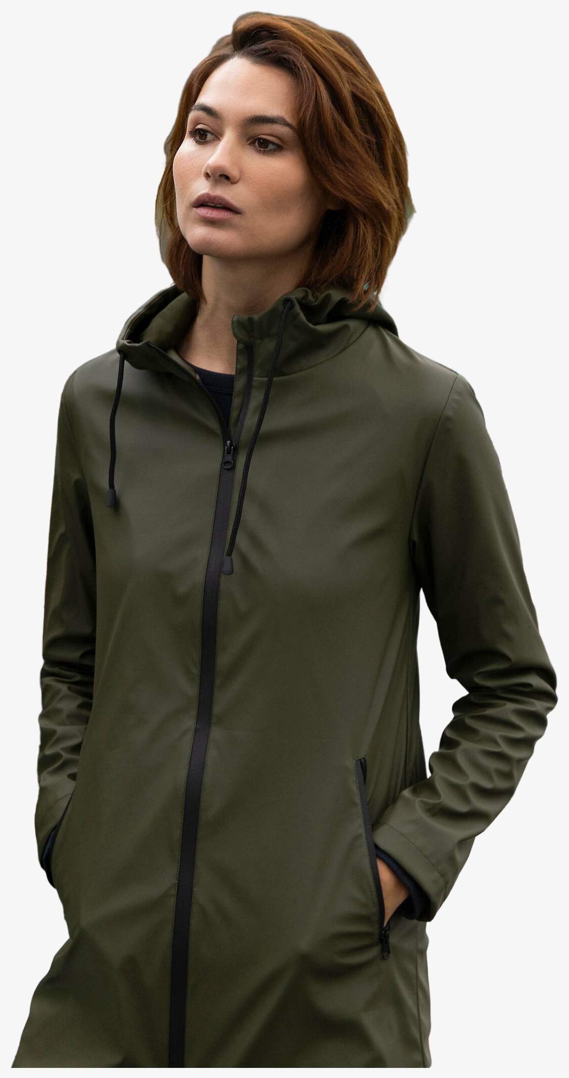De waterdichte dames regenjas heeft een opening met waterdichte ritssluiting en een capuchon met trekkoord. Hij heeft twee zakken met ritssluiting en een achterkant met een split. De naden zijn thermogeseald om lekken te beperken.