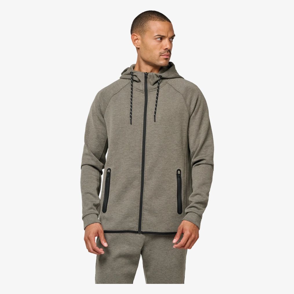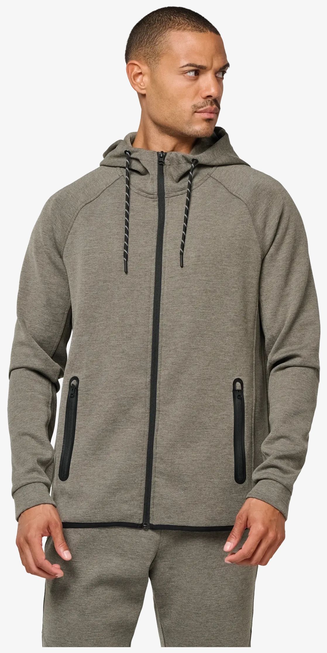 De performance capuchonvest combineert een ritsopening en twee voorzakken met thermogelaste ritsen. De capuchon is gevoerd met jersey bestaande uit polyester en viscose, uitgerust met een tweekleurige trekkoord met plastic uiteinden. De mouw- en zoomuiteinden bevatten elastische delen en contrasterende afwerkingen.
