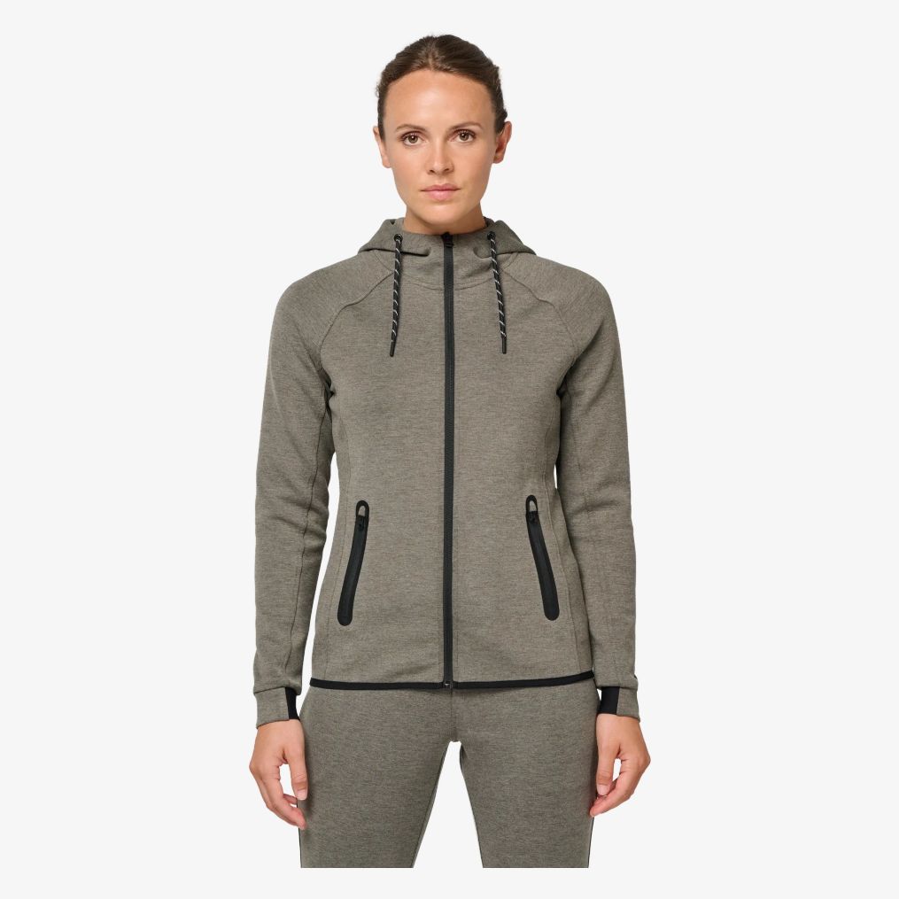 De prestatie hoodie heeft een ritssluiting en twee voorzakken thermisch geseald. De capuchon is gevoerd met jersey, voorzien van een tweekleurige trekkoord met kunststof uiteinden. Mouwen en zoom zijn aangesloten met een elastisch deel en een contrastbiesafwerking.