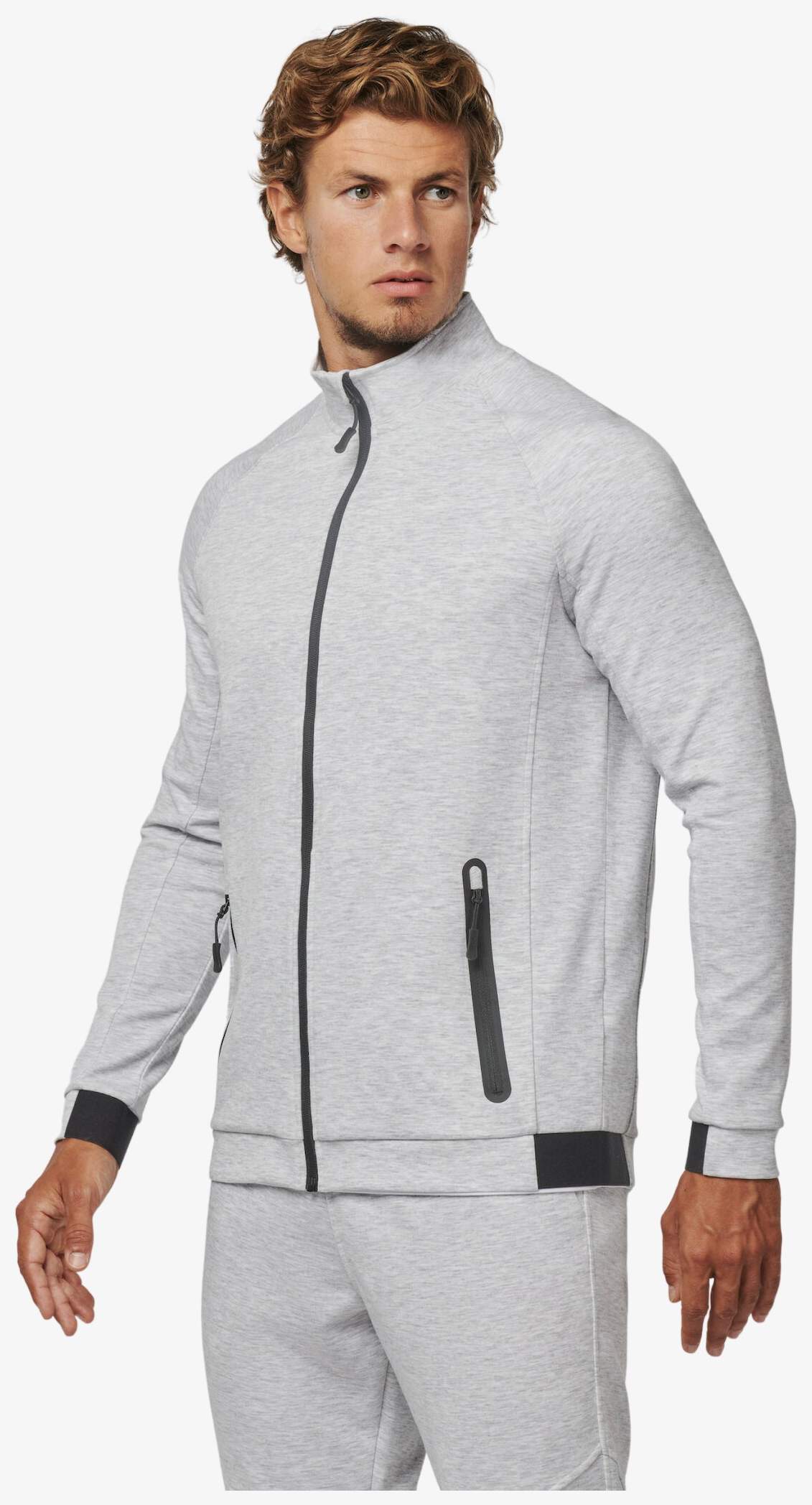 De opstaande kraagjas in polyester sweat met ritssluiting combineert een comfortabele stof met praktische afwerkingen. Het heeft een ritssluiting en twee voorzakken met ritssluiting en thermogesealde afwerking. De mouwuiteinden zijn aangesnoerd met een elastisch deel, geschikt voor dagelijks gebruik.