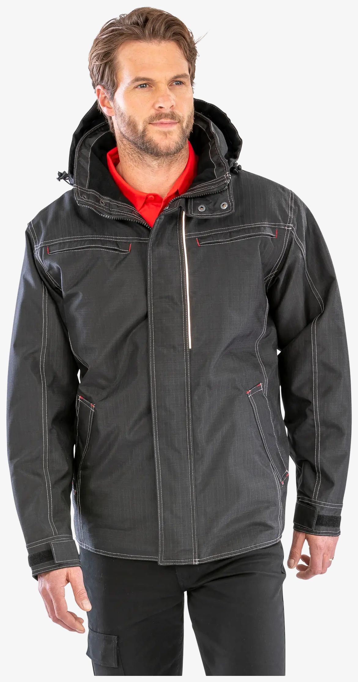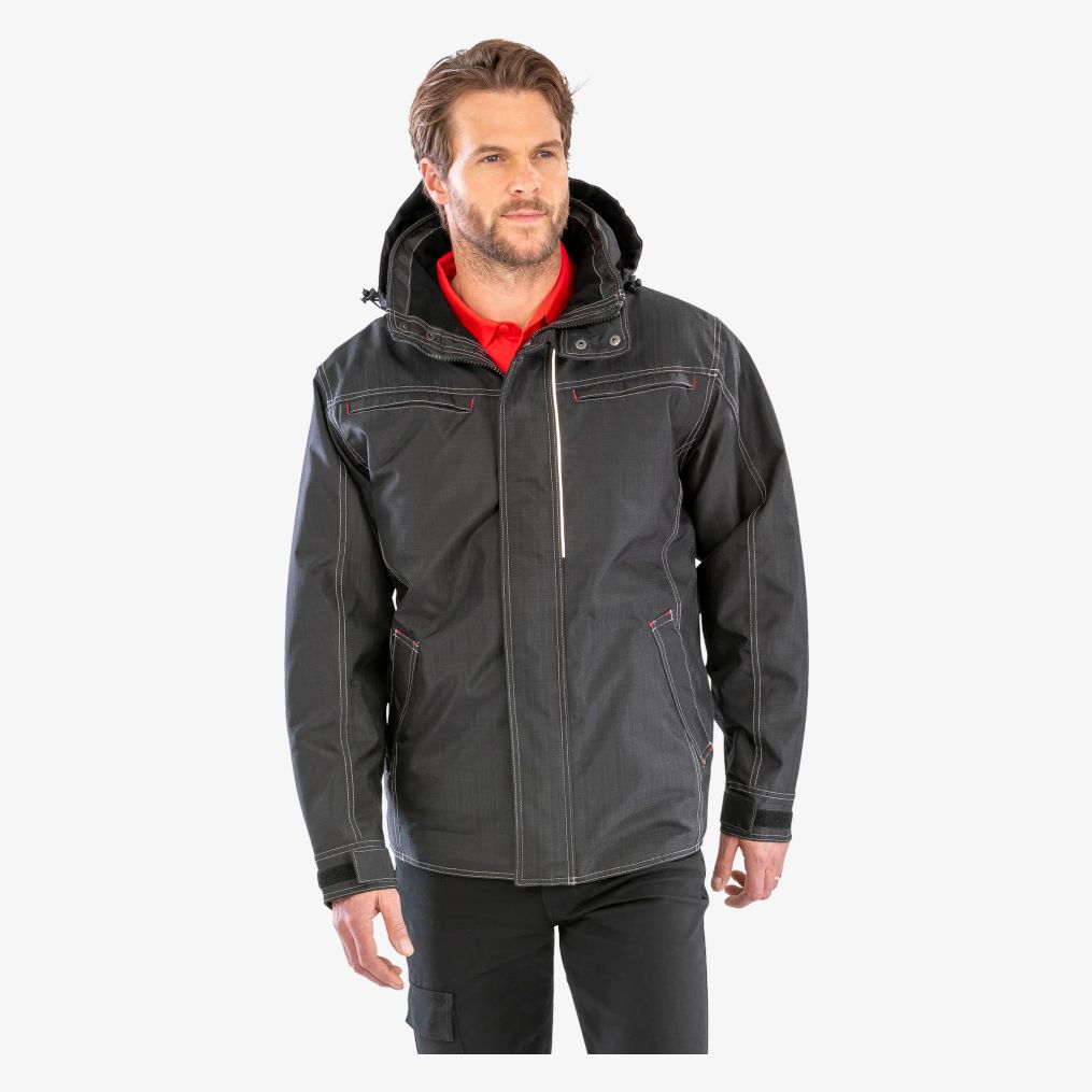 De Robuuste denimjas is geschikt voor buitengebruik bij vochtig en winderig weer, met afneembare capuchon, thermisch getapete naden en meerdere ritszakken. Aansluitende pasvorm, langere rug en reflecterende elementen voor zichtbaarheid.