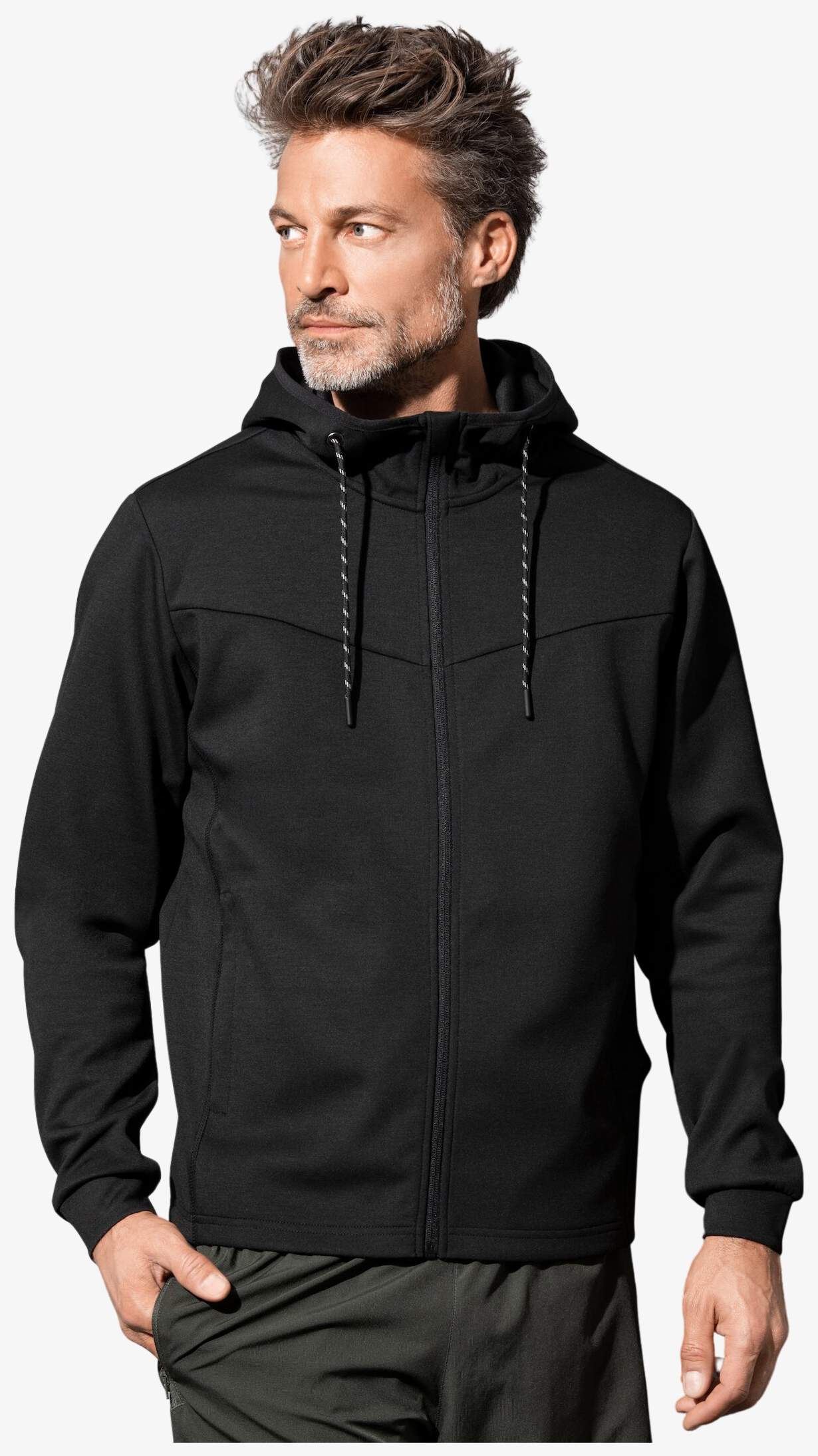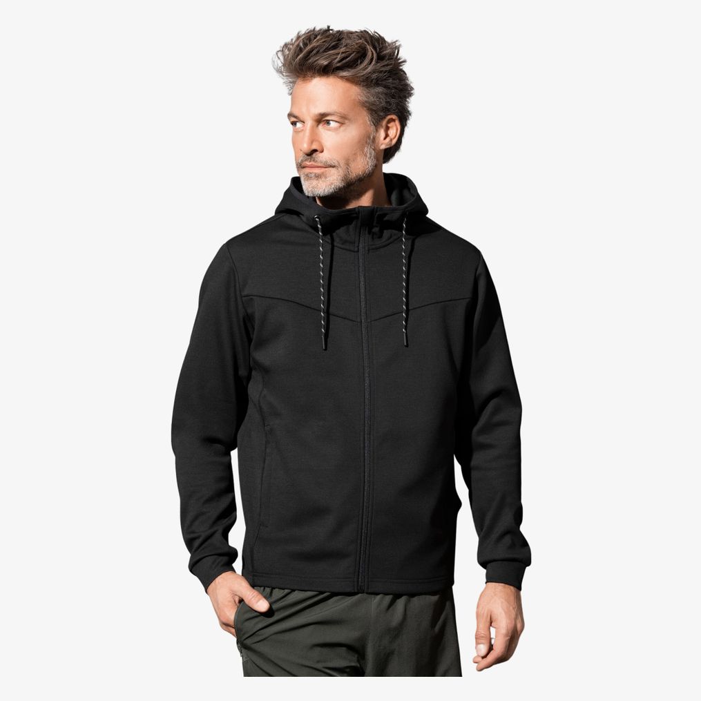 De hoodie Recycled Scuba Jacket is vervaardigd uit gerecyclede materialen, waaronder 8 plastic flessen. Hij heeft een duikersstijl capuchon met elastische band en tweekleurige koord, verborgen zijzakken met ritssluiting en flatlock sierstiksels. De stof is functioneel en ademend, zonder neklabel.