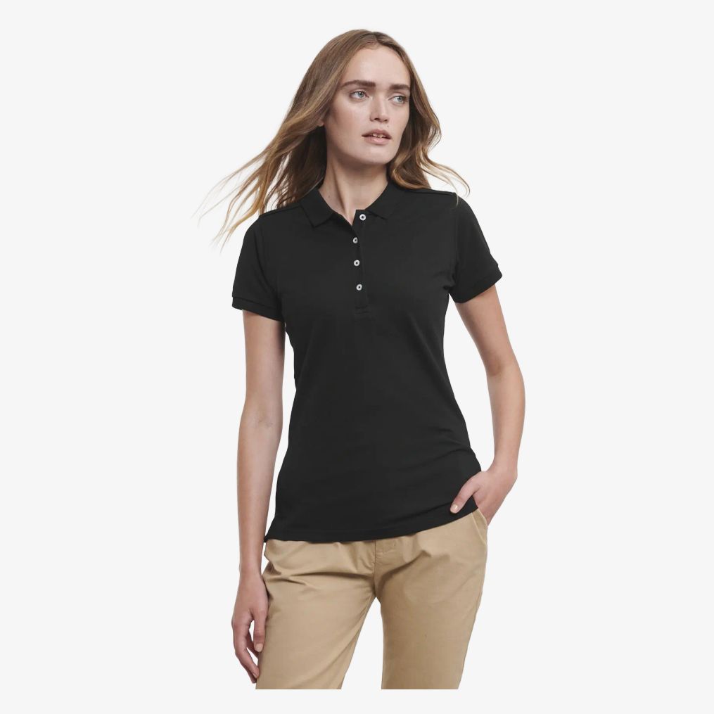 De stretch polo dames combineert katoen en elastaan voor een soepele en comfortabele pasvorm. Het heeft een kleine kraag, een rijgsluiting met 4 knopen en mouwen met ribboord. De zijopeningen en verstevigde naden bij de schouders dragen bij aan de pasvorm en duurzaamheid.