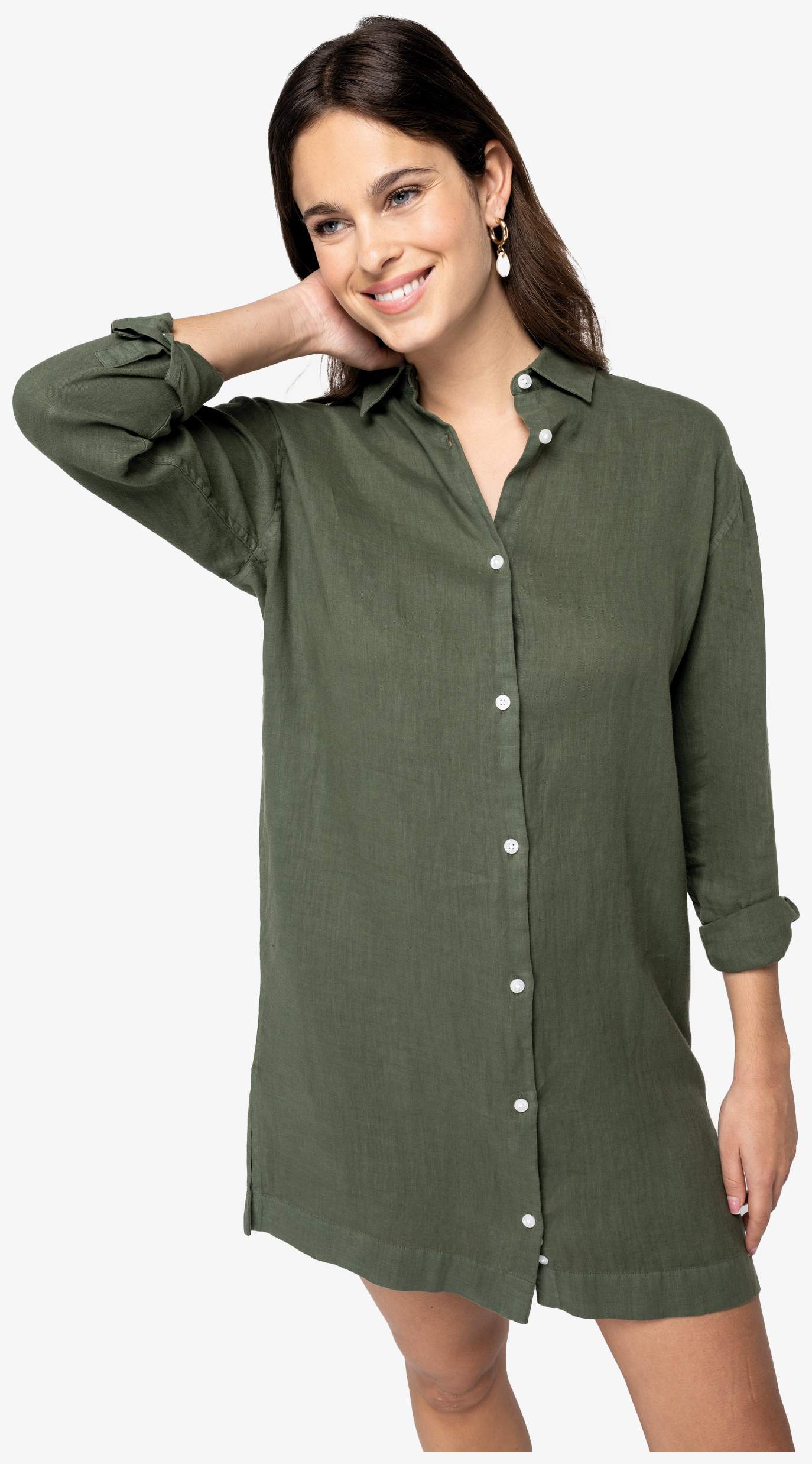 De linnen overhemdjurk sp5008 is ontworpen met een comfortabele pasvorm en doorlopende schouders en een boordkraag. Het heeft een knoopsluiting met glanzende knopen van gerecycled wit plastic. De ruginzet is dubbel gevoerd met plooien voor bewegingsvrijheid. De mouwuiteinden zijn voorzien van manchetten en een kapucijnsplit met knopen. Zijsplitten vergemakkelijken de beweging. De zoom is enkele gestikt.