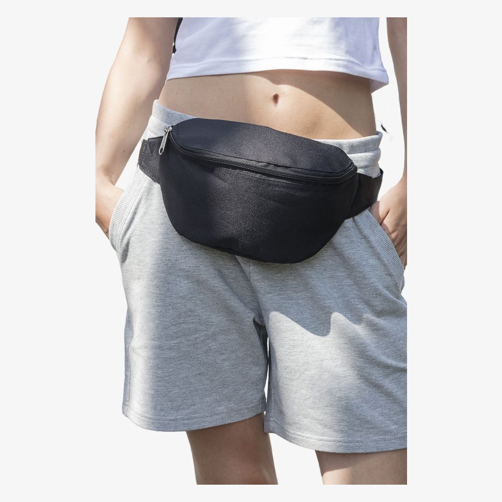 De heuptas van polyester bevat een hoofdvak en een zijvak met ritssluiting. Twee kleine open vakken bevinden zich aan de binnenzijde. De maat is 23 x 7,5 x 13,5 cm.