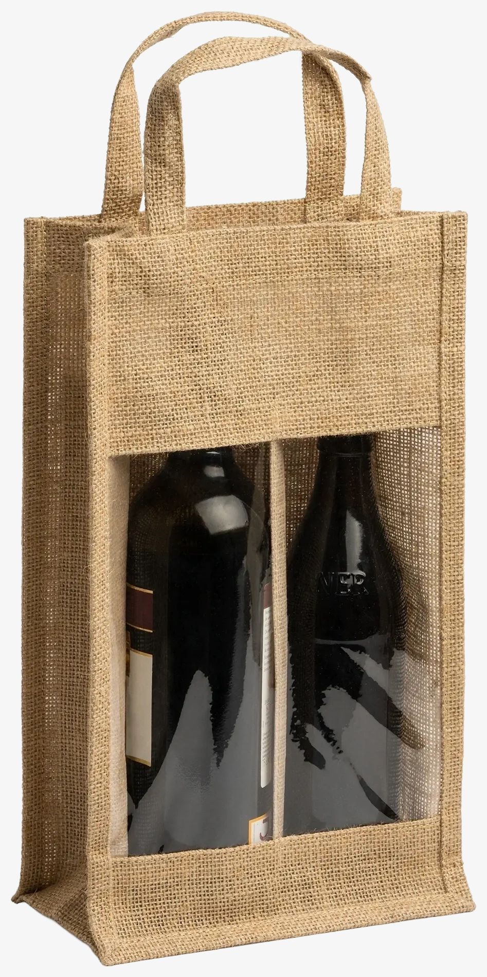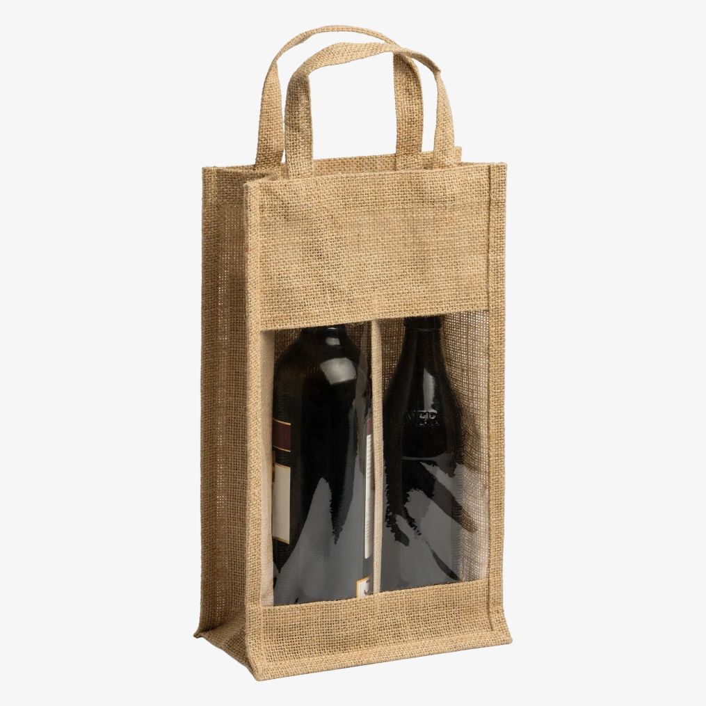 De gelamineerde jute boodschappentas heeft een venster en dubbele compartiment. Ontworpen om flessen te bevatten met versterkte handvatten.\