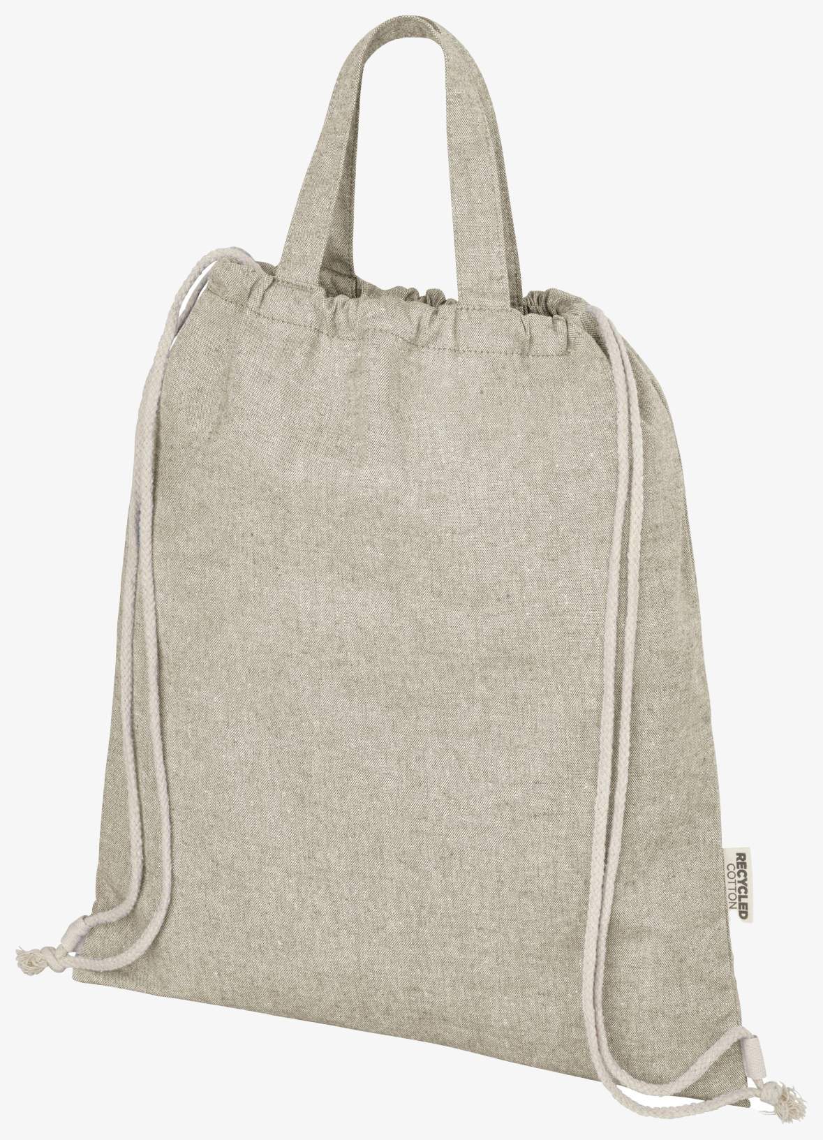 De rugzak met trekkoord is gemaakt van een mengsel van gerecycled katoen en gerecycled polyester. Het heeft een groot hoofdvak met een trekkoordsluiting van natuurlijk gekleurd katoen. Het gerecyclede katoen komt van pre-consumptie afval dat ontstaat tijdens het snijproces, met een mengsel van vergelijkbare kleuren zonder extra verf. Er kan een lichte kleurvariatie optreden afhankelijk van de aard van het gerecyclede katoen.
