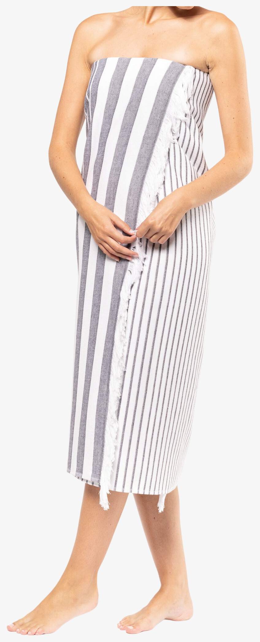 De gestreepte fouta is een jacquard katoenen handdoek ontworpen met een geweven zijde en een badstof zijde die absorptie en droging vergemakkelijkt. Het meet 100 cm x 180 cm.