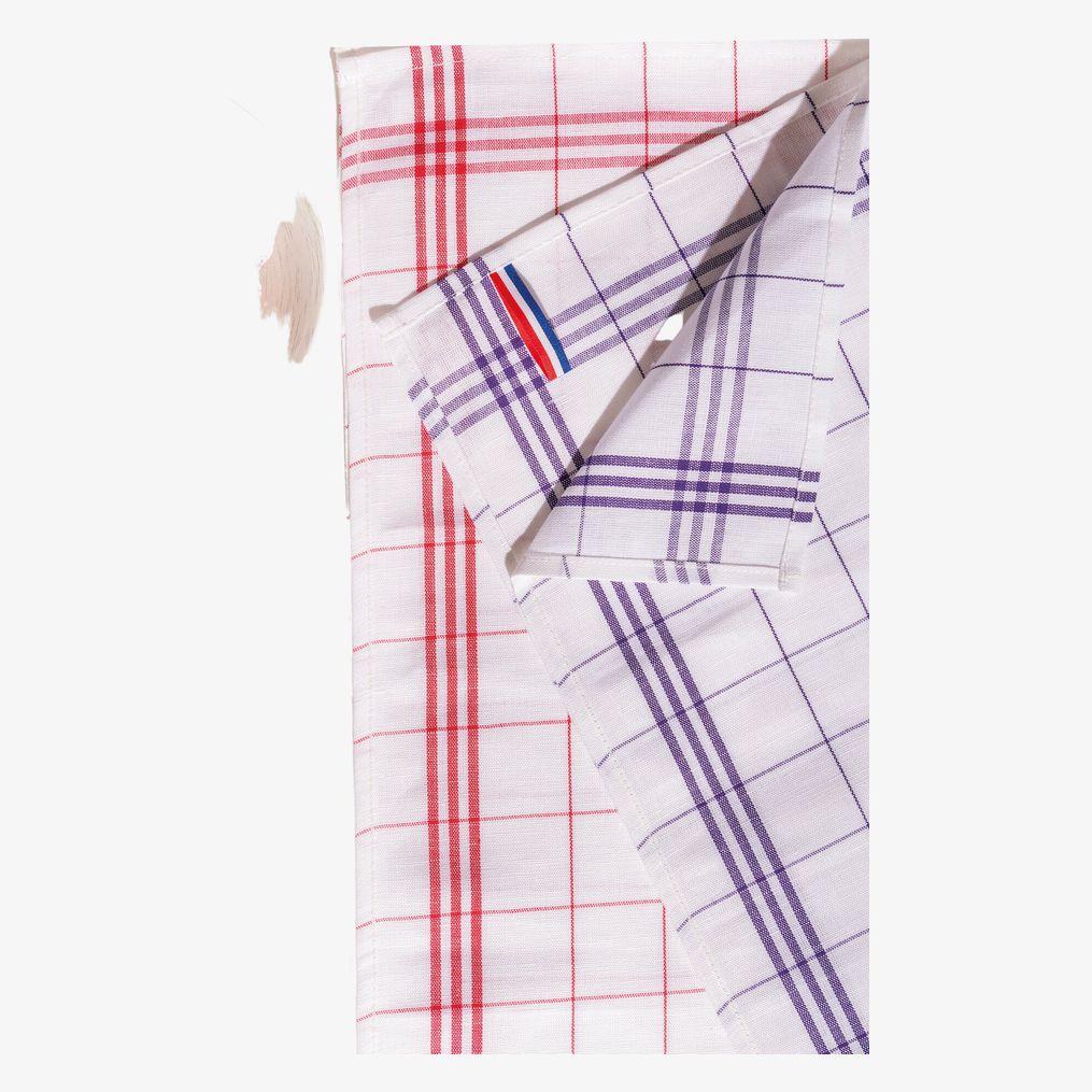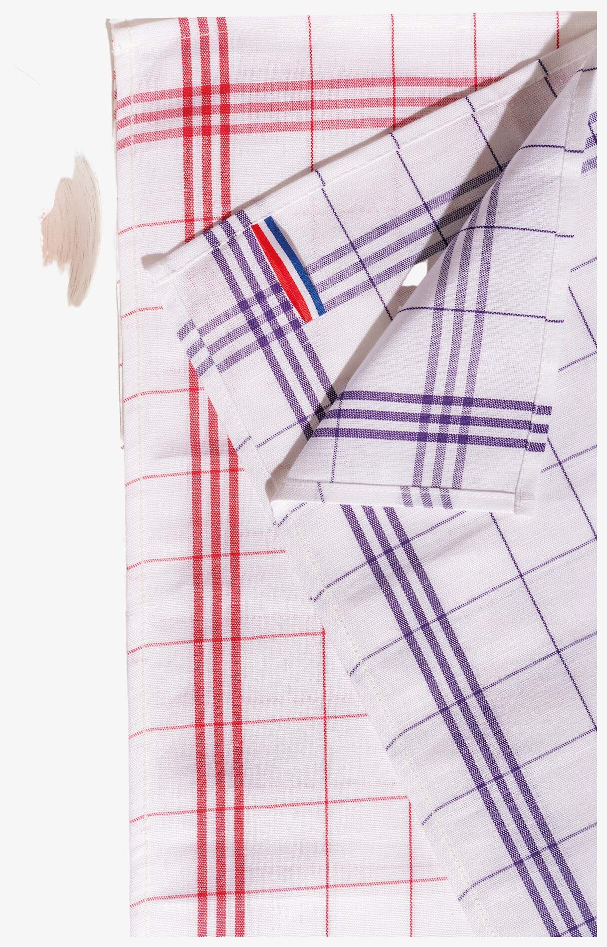 Het geblokte glazendoek heeft drie strepen aan elke kant met een driekleurig label dat de Franse vlag weergeeft en dient als ophanglus. Het zelfklevende, afneembare label vermeldt Origine France garantie - Product Bretagne.