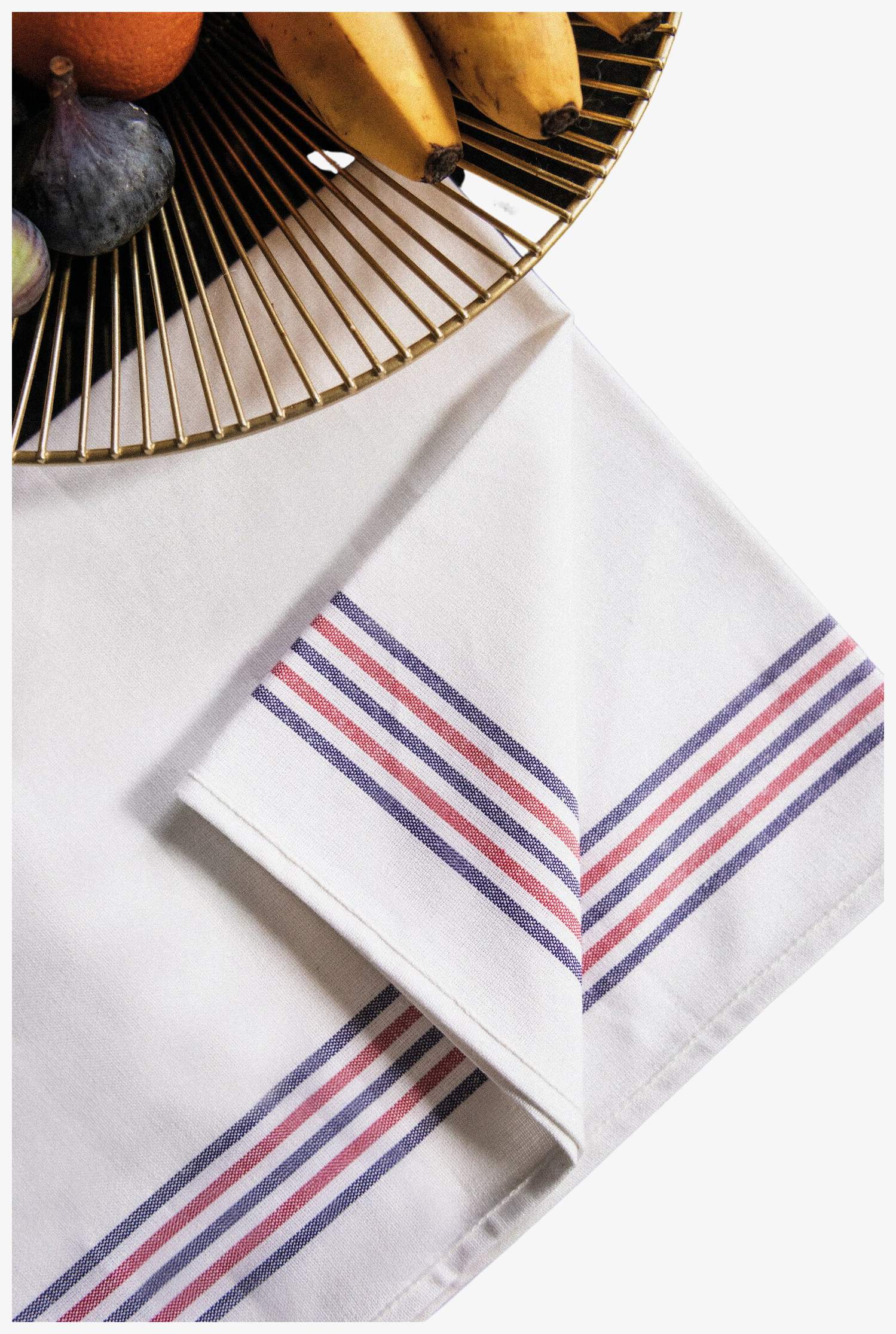 De theedoek van katoenen doek heeft 5 strepen aan elke kant. Voorzien van een driekleurig label dat dient als ophanglus. Afmetingen 82 x 48 cm.
