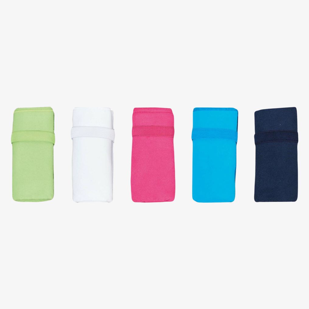De lichte sporthanddoek van microvezel zorgt voor snelle droging dankzij de samenstelling van polyester en polyamide. Hij is ontworpen om gemakkelijk op te vouwen met elastische overlockafwerkingen genaaid in bijpassende kleur.