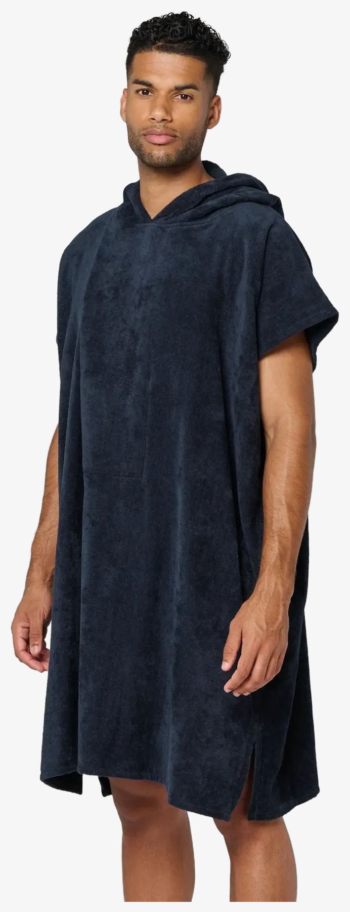 De uniseks badstof poncho met capuchon is gemaakt van absorberende terry stof. Hij heeft een overlappende capuchon aan de voorkant, een grote centrale binnenzak en twee zijopeningen op halve hoogte voor makkelijk aan- en uitkleden.