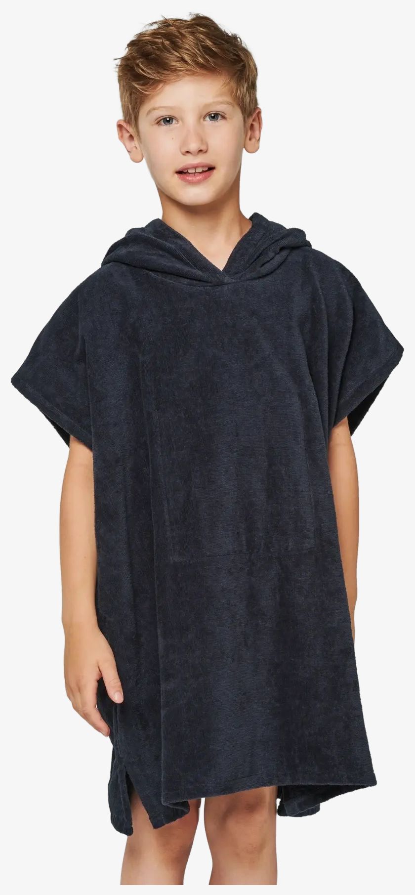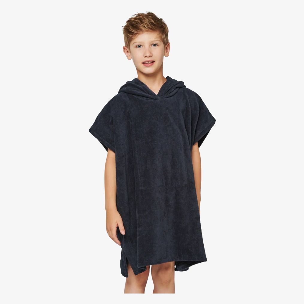 De poncho badstof met capuchon voor kinderen is gemaakt van absorberende terry stof met een gekruiste capuchon aan de voorkant en een grote centrale zak die aan de binnenkant open is.
