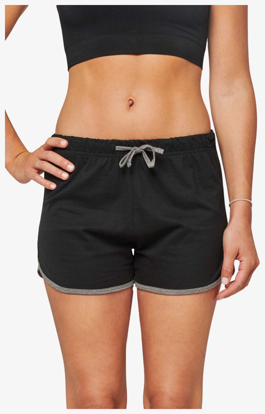 De short sport vrouw is gemaakt van jersey stof met een samenstelling bestaande uit voornamelijk katoen en een variant met polyester. De elastische taille zorgt voor een passende pasvorm terwijl de contrasterende biezen en het aantrekkoord functionele details bieden.