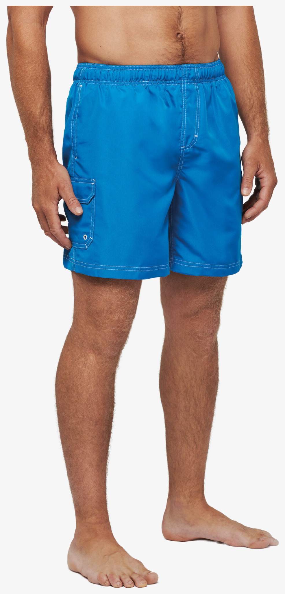 De short bain homme is vervaardigd van microvezel polyester met een stof die aanvoelt als perzikhuid en snel droogt. Het heeft een elastische tailleband met trekkoord en een geïntegreerde mesh slip. Er zijn meerdere zakken, waaronder twee zijzakken en een opgestikte zak met klep en oogsleuf. Contrasterende stiknaden zorgen voor de afwerking.
