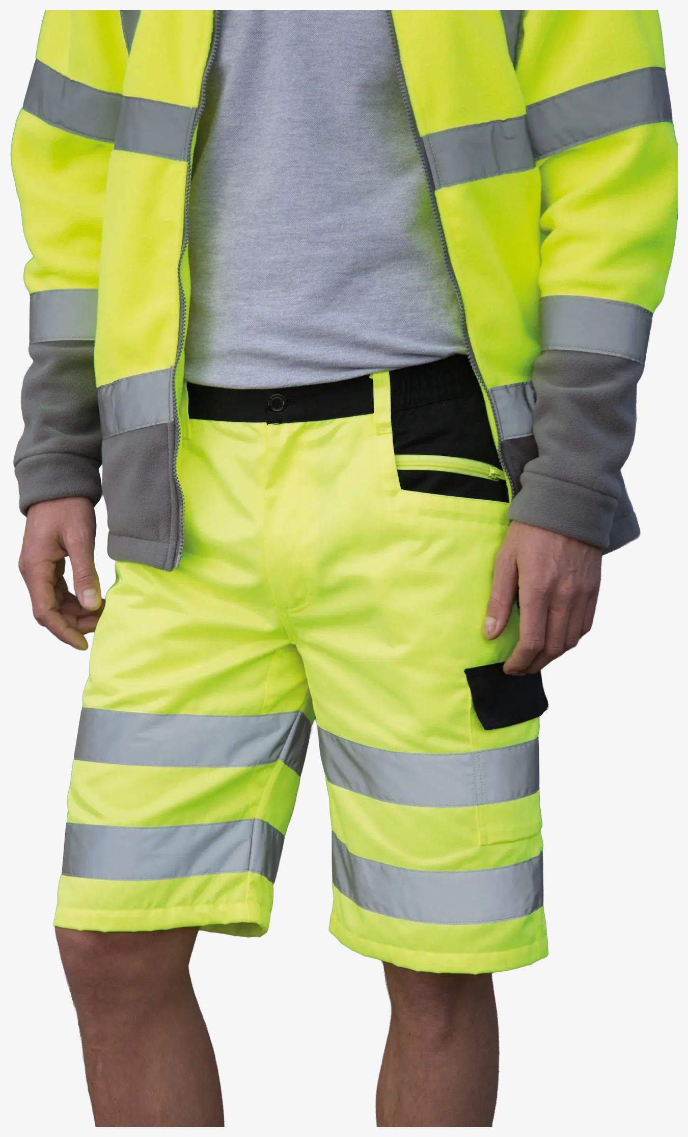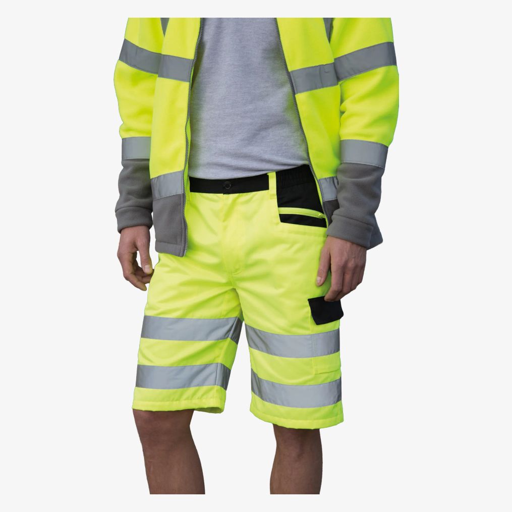 De Safety Cargo Shorts is een WORKGUARD high-visibility short met gedeeltelijk elastische taille en riemlussen. Reflecterende banden, zijcargozak, zijzakken en achterzakken voor rolmaat.