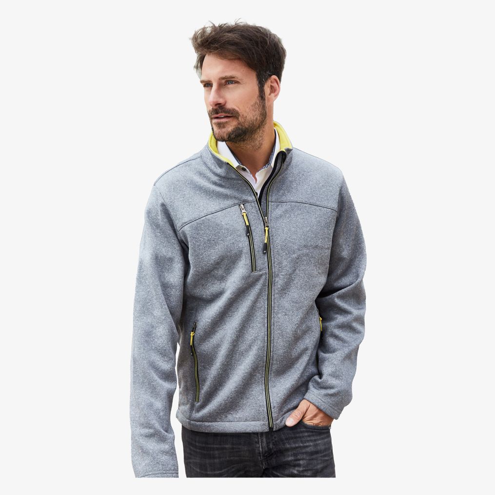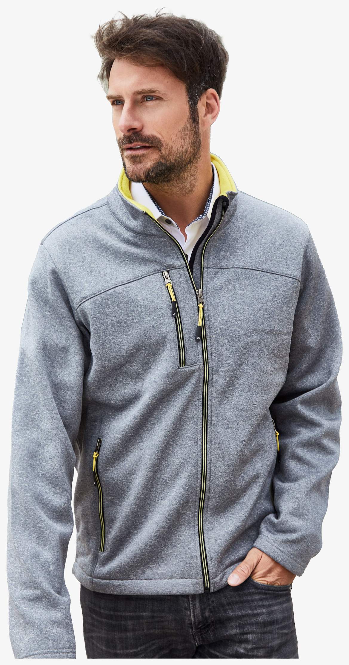 Het Men's Softshell jack is een lichtgewicht en licht getailleerd jack met een gemêleerde stijl. Gemaakt van tweelaagse softshell met contrasterende fleece voering. Het jack heeft een doorlopende gerolde ritssluiting aan de voorkant met kinbescherming, een opstaande kraag, twee zijzakken en een borstzak met rits.