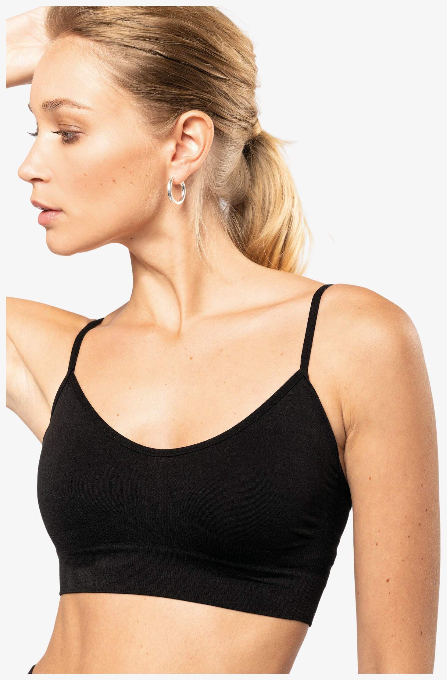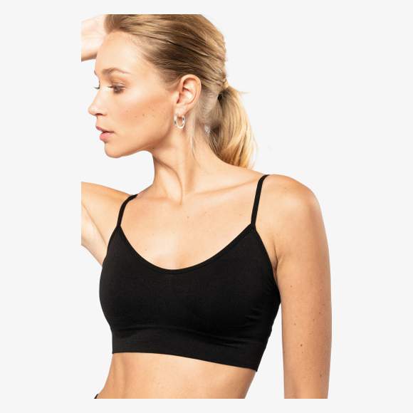 De naadloze beha heeft een Skinny pasvorm met een ergonomisch breisel ontworpen voor maximaal comfort. De halslijn voor en achter en de bandjes zijn afgewerkt met een biais.