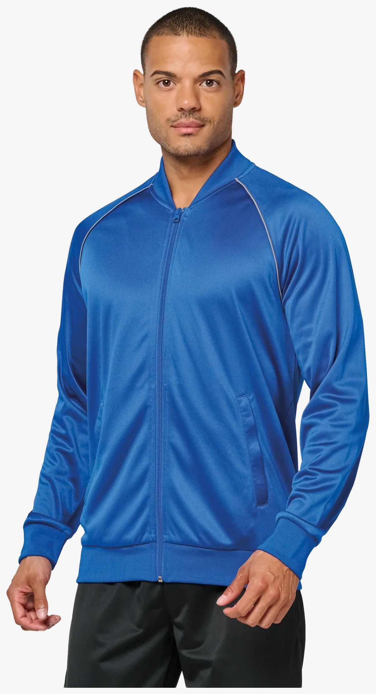 Het polyester trainingsjack pa384 heeft een recht model met een ton-sur-ton ritssluiting. De raglanmouwen worden benadrukt door een contrasterende bies. De kraag en manchetten zijn van 1x1 ribstof. Twee ritssluitingen aan de zijzakken zijn geïntegreerd voor opbergruimte.
