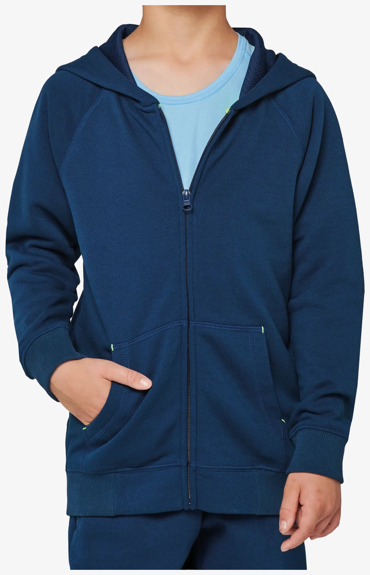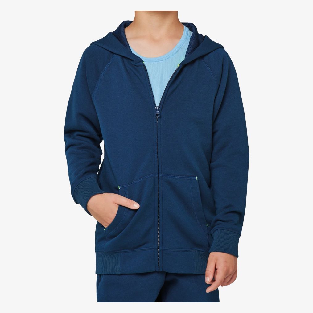 De hooded zip jas voor kinderen combineert geborsteld fleece en gekamde katoen voor verhoogd comfort. De capuchon is gevoerd met ton-sur-ton mesh en voorzien van een binnenband voor extra afwerking. De sluiting is een nylonzipped. De kangoeroezakken bevatten een fluorescerende telefoonzak. Raglanmouwen en dubbele manchetten zorgen voor een goede bevestiging.