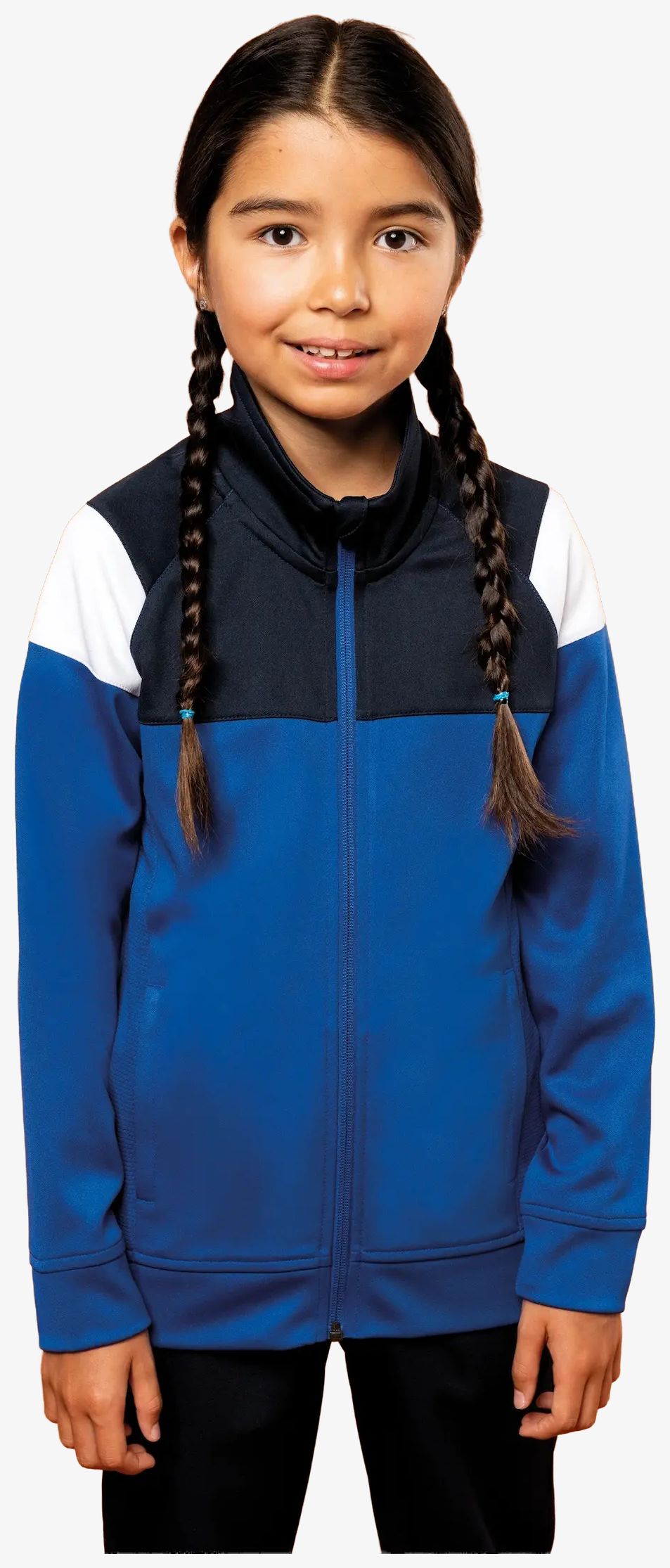 De veste survêtement zippée enfant is vervaardigd uit mat polyester interlock. Hij heeft een rechte snit met een voorkant met omgekeerde nylon ritssluiting in toon op toon. De raglanmouwen zijn voorzien van contrasterende inzetten op de schouders. De borst- en schouderuitsnijding is contrasterend. Een aangebrachte band van dezelfde stof omsluit de onderkant van de mouwen en de tailleband. Twee zakken met rits bevinden zich aan de voorkant. Inzetten van gestructureerde stof zijn geplaatst aan de zijkanten van de rug. De rits aan de kraag is afgewerkt voor extra comfort. Het merklabel is afneembaar.