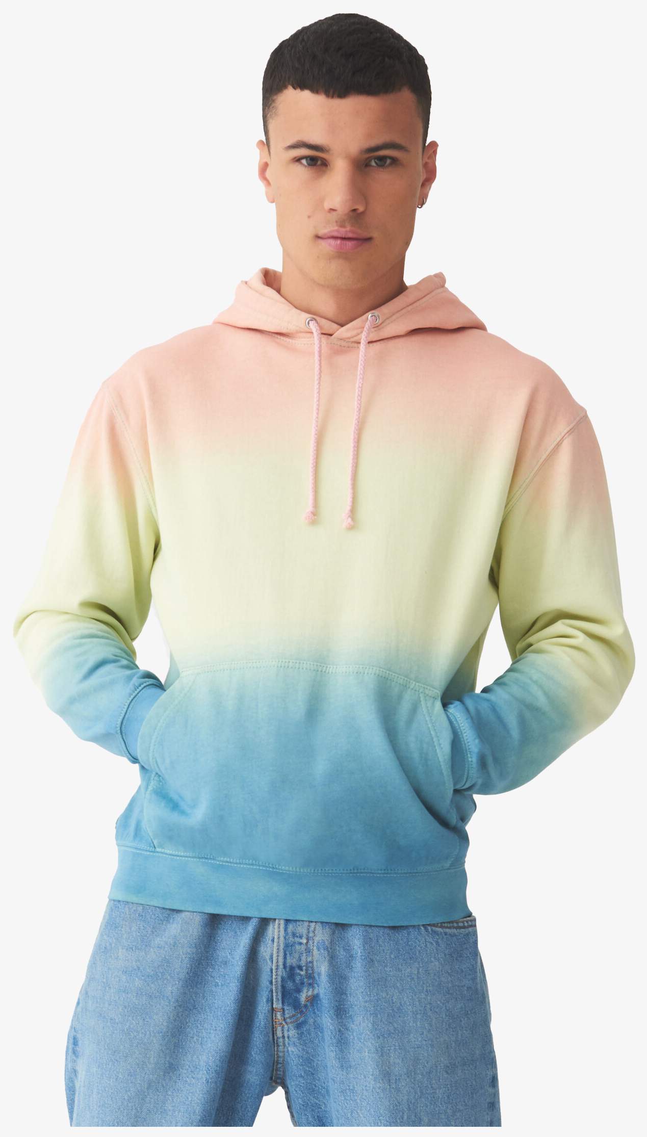 De tie-dye hoodie combineert ringspun katoen en polyester met een bimateriaal capuchon voorzien van verstelbare ronde koorden. Hij heeft geïntegreerde kangoeroezakken en een geborstelde fleece binnenkant die een specifieke textuur geeft. De boorden en zoom zijn geribbeld voor een passende afwerking.