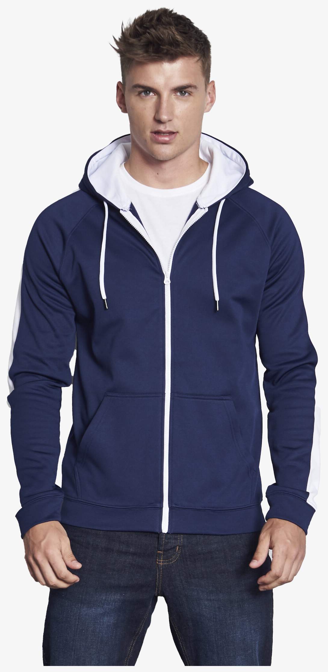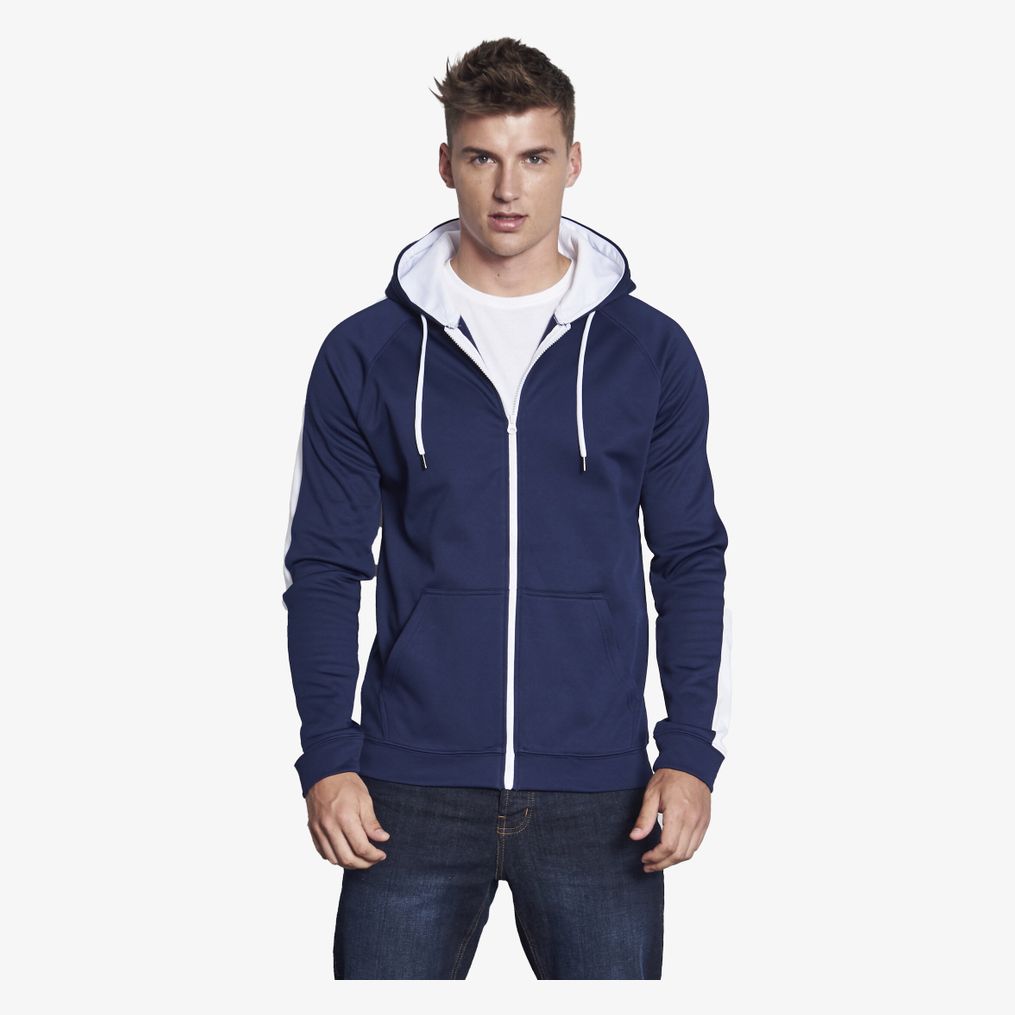 De rits hoodie heeft contrasterende strepen op de mouwen, een volledige ritssluiting, een kangoeroezak en contrasterende trekkoorden. De capuchon is driedeelig met contrasterende voering. Afwerking met dubbele stiknaden en uitneembaar label.