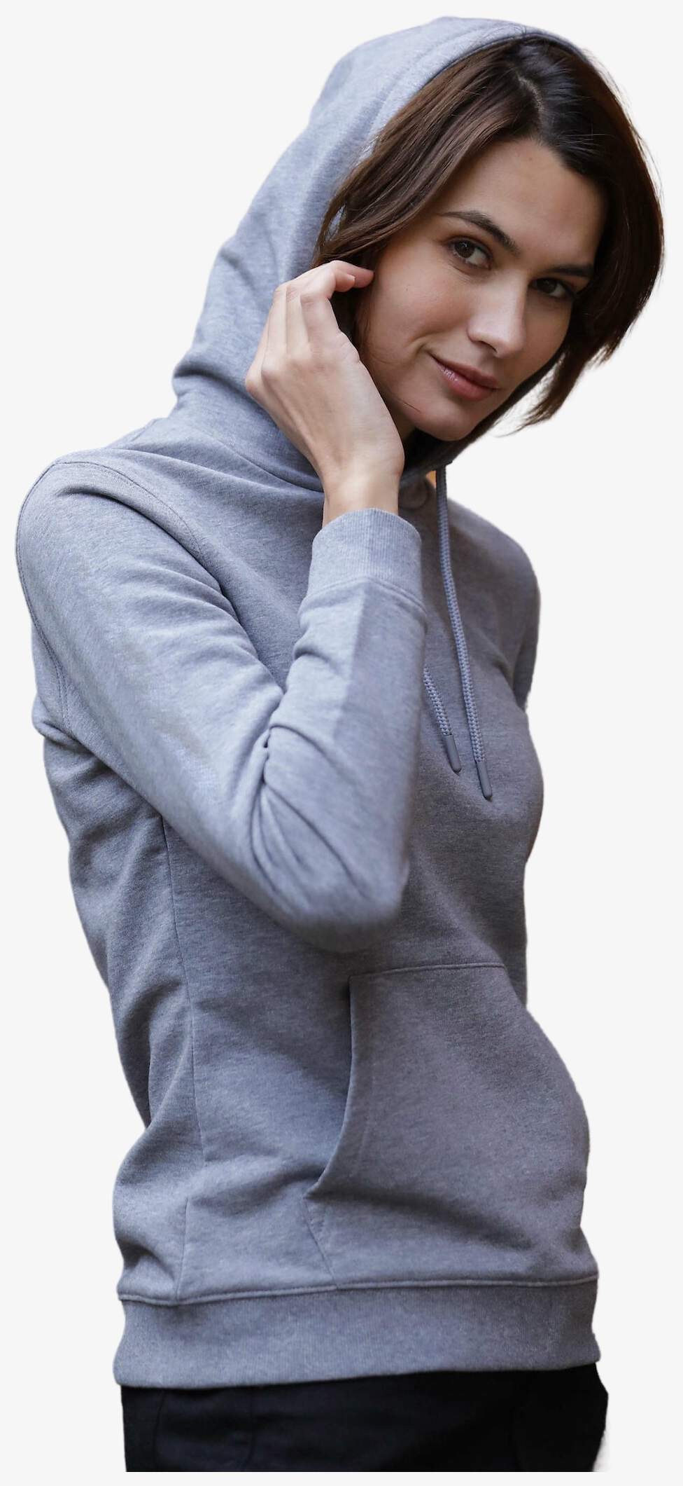 De dameshooded sweater heeft een kangoeroezak en een capuchon met trekkoorden. De oogjes hebben uiteinden in dezelfde kleur als de stof. De voering is van jersey. De 2x2 boordafwerkingen bevinden zich aan de mouwen en de onderkant. Een halve maan schoonheidsband zit aan de binnenkant van de kraag. De stof is French Terry.