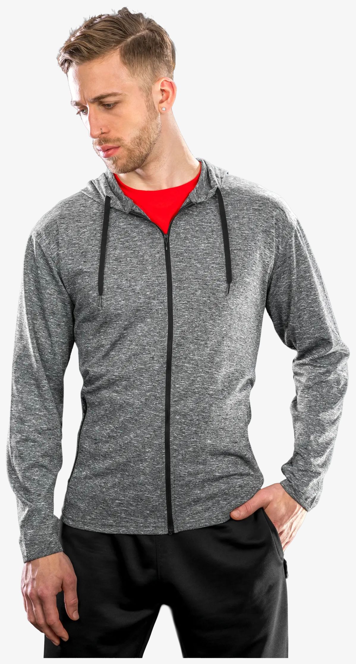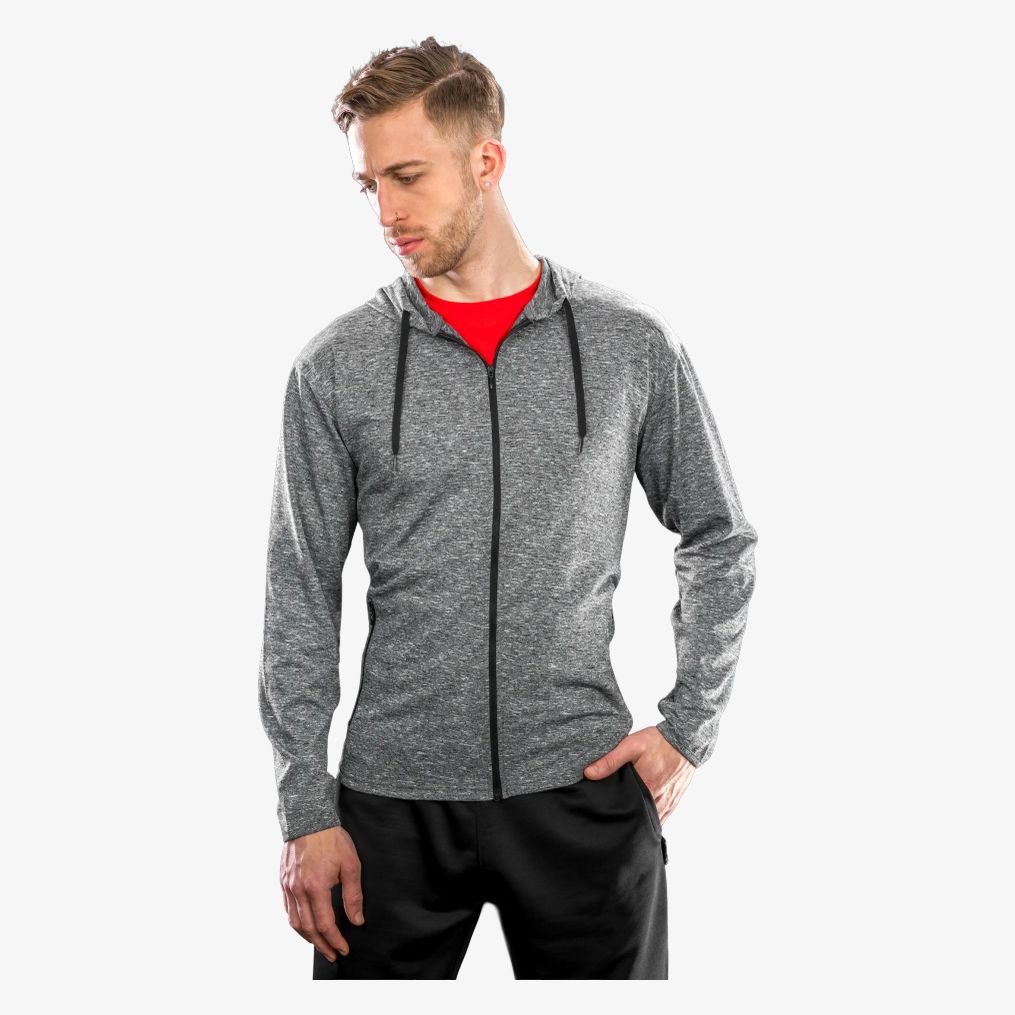 De Mens Hooded tee Jacket is een lichte polyester hoodie van rekbare stof, geschikt voor sportactiviteiten. Sneldrogend, capuchon met trekkoord, zijzakken met rits en getailleerde taille. Manchetten en taille niet-elastisch.