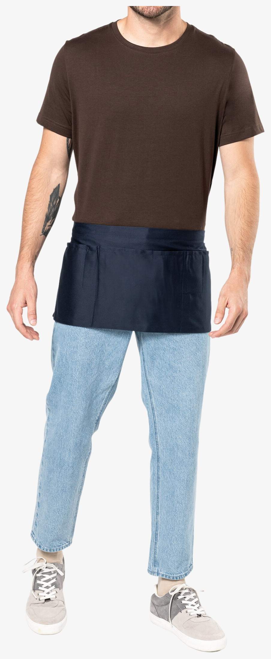 De korte polycotton schort is vervaardigd uit 65% polyester en 35% katoen met een Denim-versie in 65% katoen en 35% polyester. Het bevat vijf zakken, waarvan drie grote en twee smalle. Het Denim-model ondergaat een speciale behandeling die een verweerde uitstraling met kleurvariaties tussen de stukken creëert.