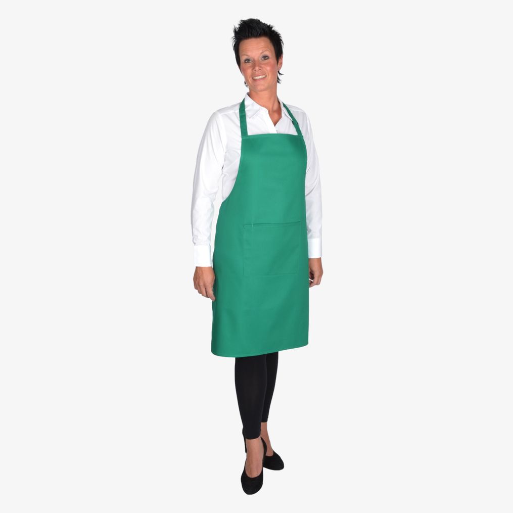 Het schort is gemaakt van 80% polyester en 20% katoen met een natural variant in 100% katoen. Het is voorgekrompen en onderhoudsvriendelijk met een 2/1 twill weefsel. De nekband is verstelbaar en bevat een voorzak van 20x25 cm. De afmetingen zijn 72 x 85 cm.