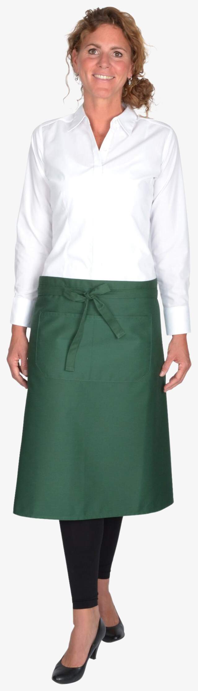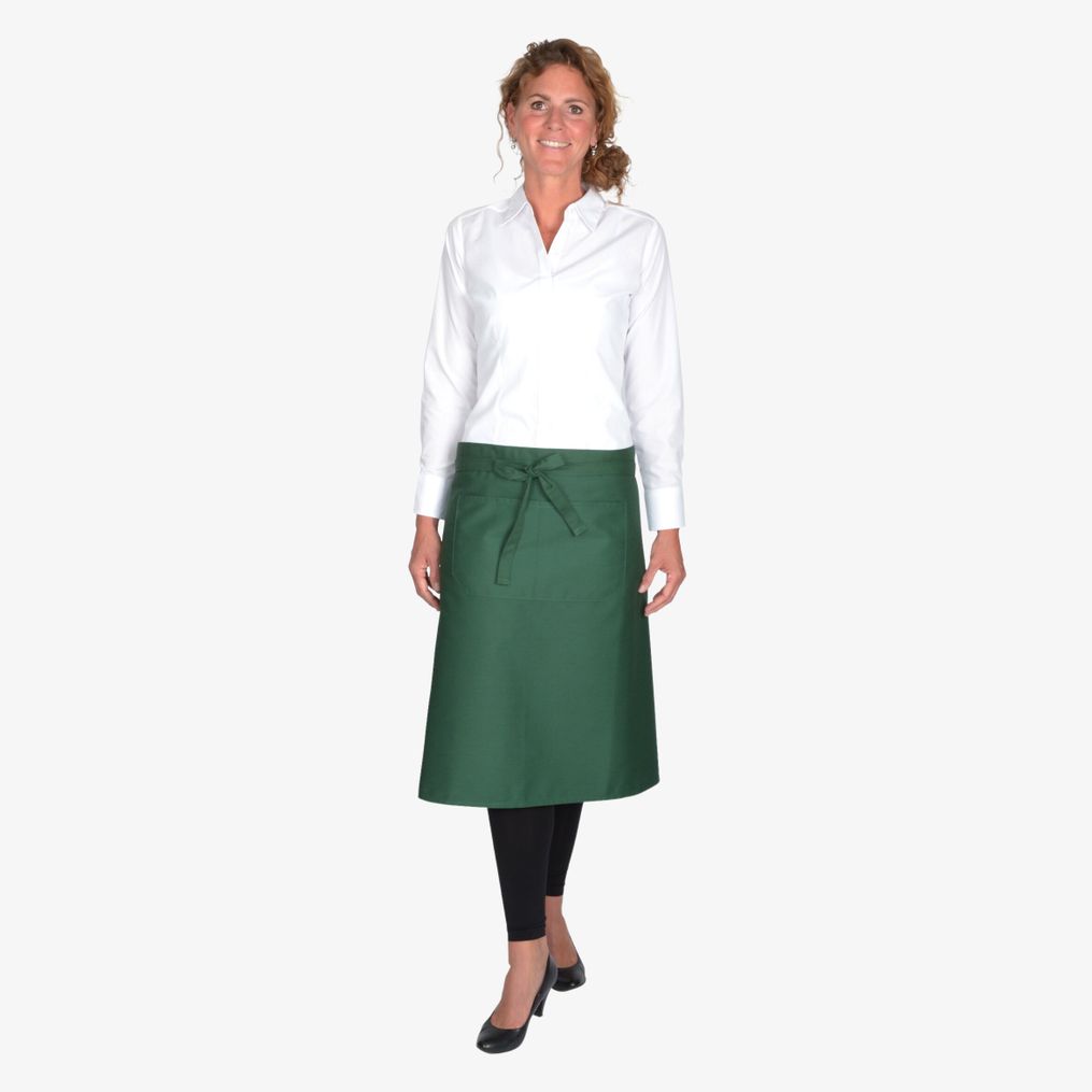 Het ks70100z koksschort is een korte versie met geïntegreerde zak. Het is vervaardigd met verstevigingen op spanningspunten en kleurvaste stoffen. Afmetingen: 100 x 70 cm.