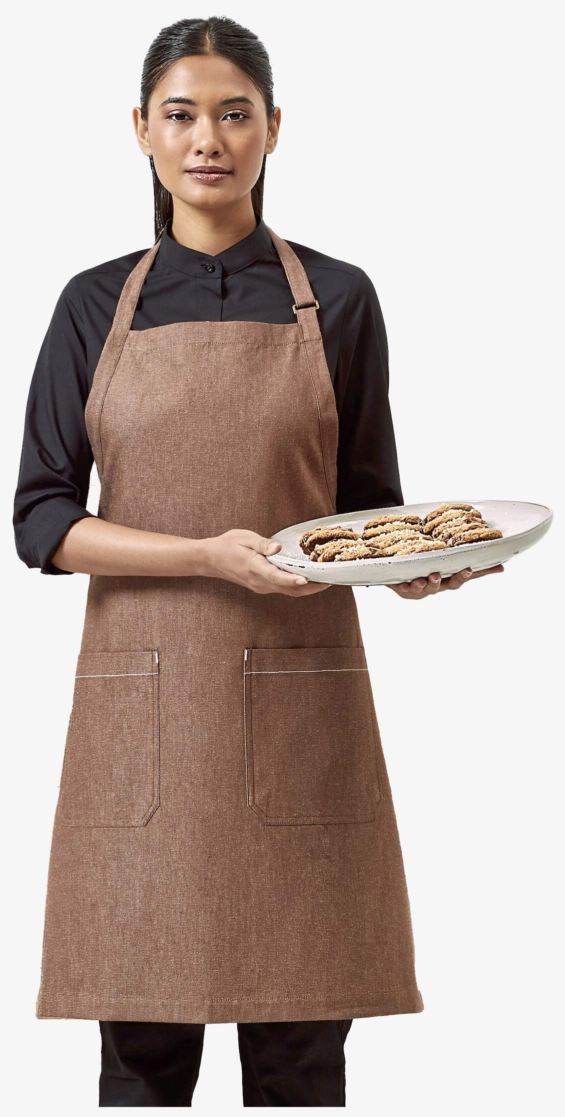 De tablier bavette durable denim is gemaakt van biologisch sergé katoen. Hij is 80 cm lang en 72 cm breed. De lange riemen zijn 107 cm. Hij heeft twee zakken met klep, 20 cm diep en 19,5 cm breed, versierd met contrasterende stiksels. Een messing gesp in antieke bronsstijl regelt de hoogte aan de nek.