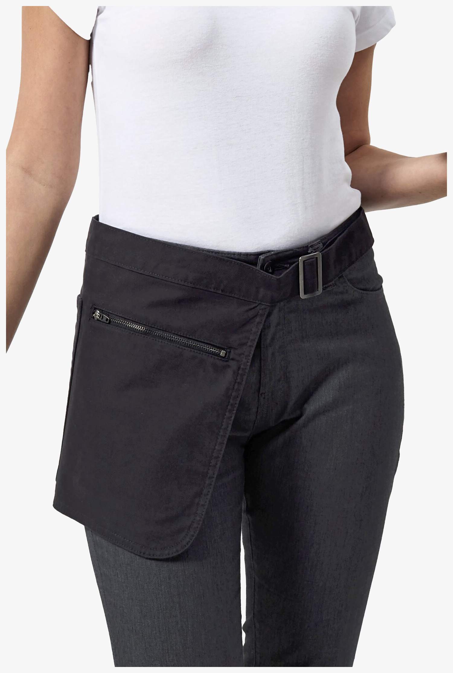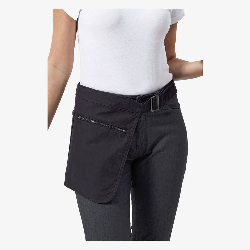 tablier hanche utilitaire metro is ontworpen om op de heup te dragen met gemakkelijke toegang tot het zakje. Het heeft een jean-stijl YKK-ritssluiting en een verstelbare riem van dezelfde stof die rond de taille loopt. De bevestiging gebeurt met een karabijnhaak en een D-ring van verouderd messing. De stof is zwaar katoenen canvas.