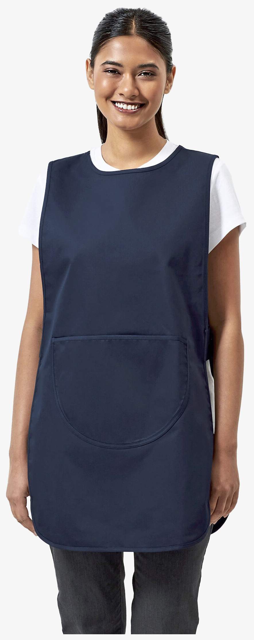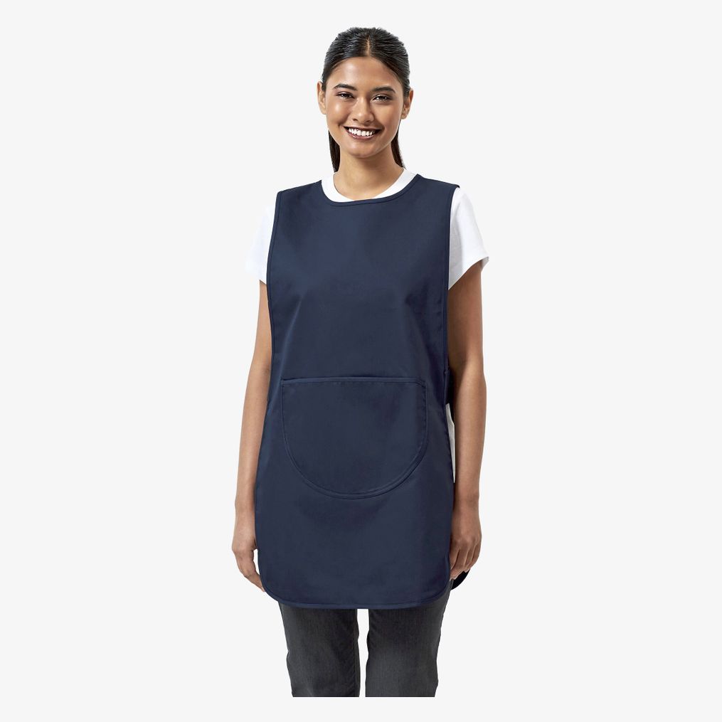 De Chasuble long avec poche pour femme wordt over kleding gedragen voor dagelijks gebruik. Opgestikte voorzak met asymmetrische randen. Verstelbare sluiting aan de zijkanten met drukknopen. Lengte ca. 78 cm.