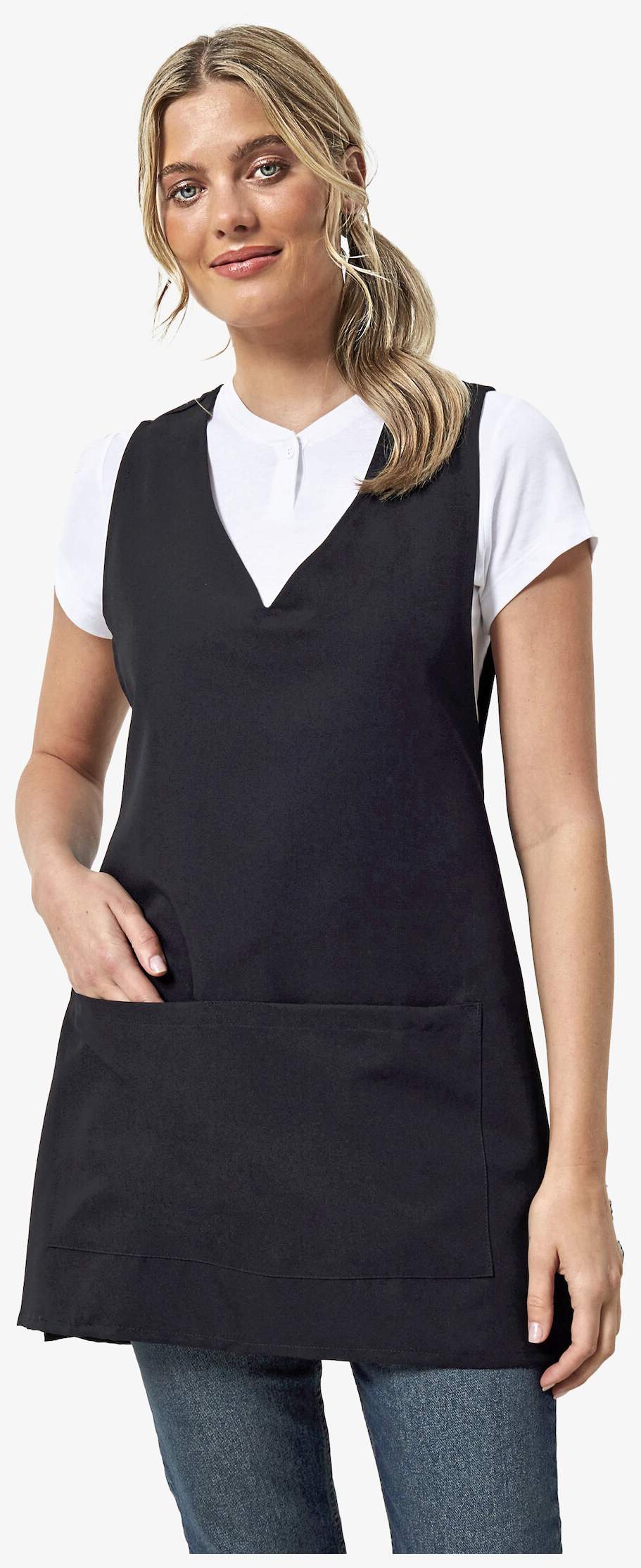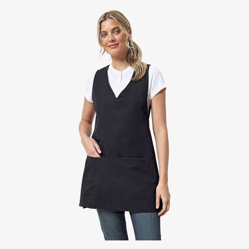 De wikkeltuniek voor dames is ontworpen met een V-hals en schuifopeningen aan de zijkant voor comfort. Voorzien van een centrale opgenaaide zak van 39 cm breed en 21 cm diep. De stof is effen polyester. De lengte is 83 cm.