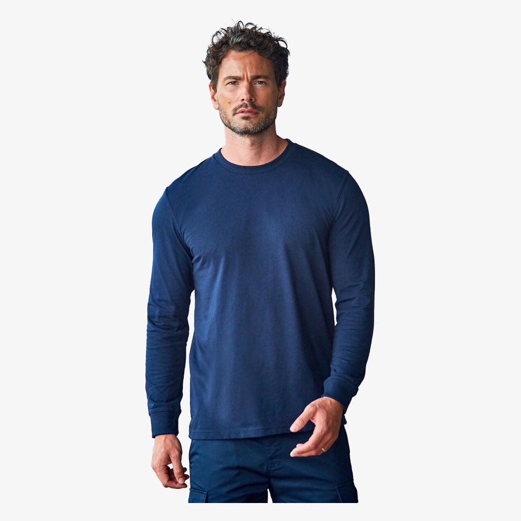 De langarm tee-shirt heeft een klassieke pasvorm met een effen geribde hals en geribde manchetten. De zijnaden en de toplagen bij de hals en armsgaten versterken de structuur.