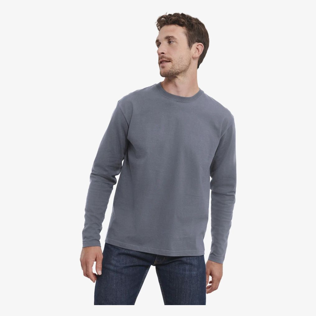 De tee-shirt met lange mouwen en klassieke snit is gemaakt van 100% ringspun katoenen tricotstof. De buisvormige constructie en de 1x1 geribde boord bij de hals met dubbele naad zorgen voor een stabiele en comfortabele pasvorm. De schouderband van schouder tot schouder voegt een nette afwerking toe.