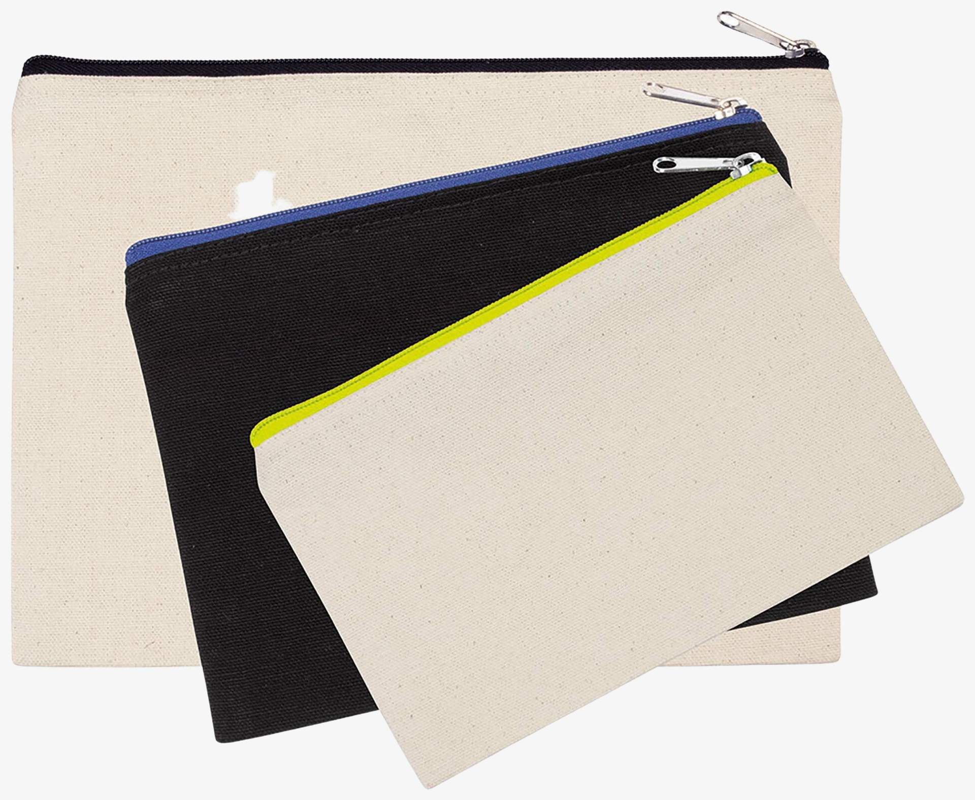 Het grote katoenen canvas etui is ontworpen om verschillende voorwerpen te bevatten met een contrasterende ritssluiting die sluiting garandeert.